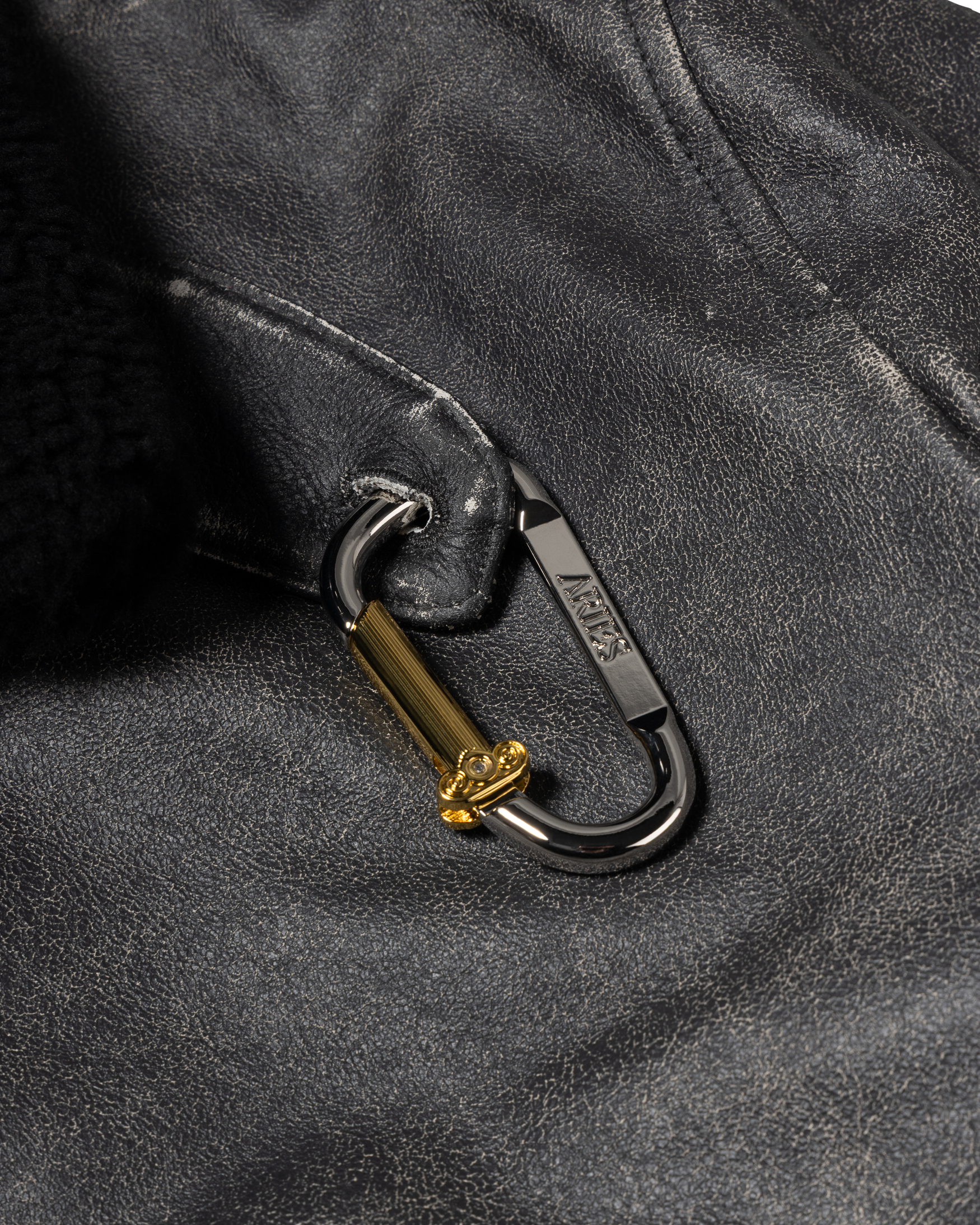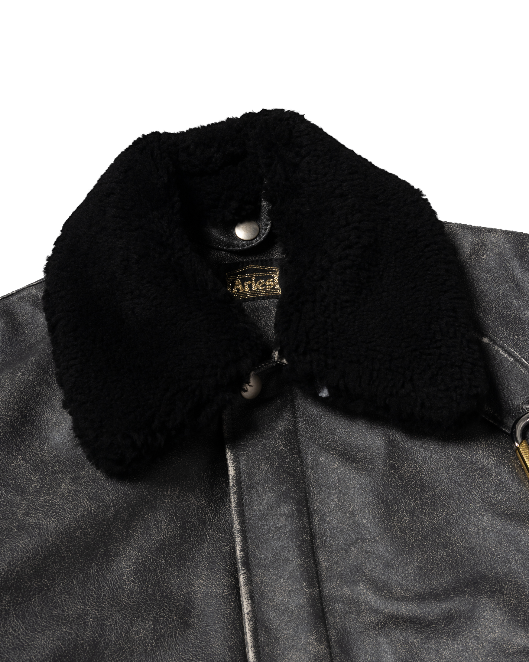 Classic flight bomber jacket shape with double patch and welt pocket detailing, in a smooth distressed leather. With a fully quilted lining and a detachable sheepskin collar. Featuring an embossed Temple patch on the back. 100% Cow Leather / 100% Polyester Lining / 100% Sheepskin Collar