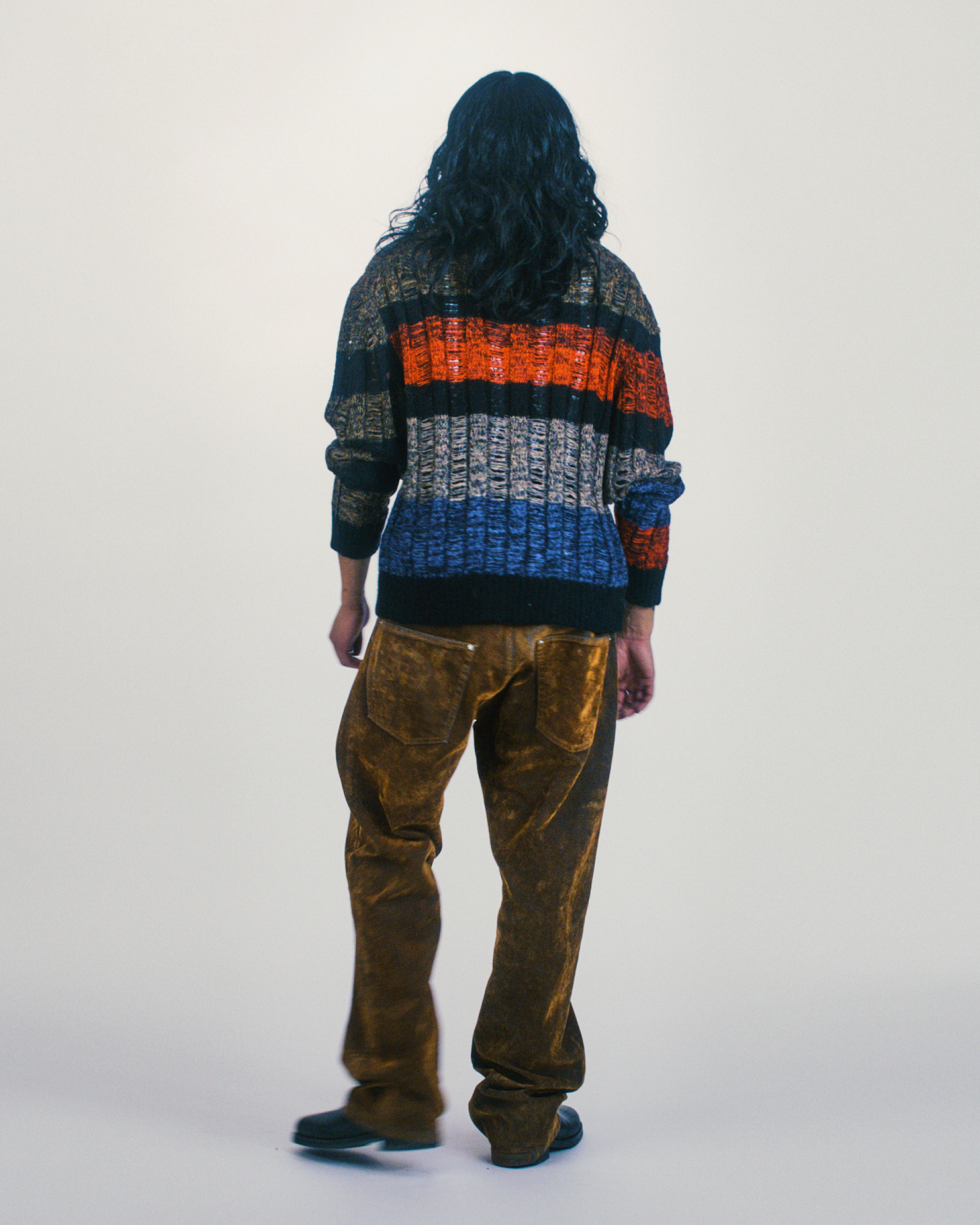 Unisex crew neck jumper knitted from a mohair yarn with a multi coloured laddered stripe.