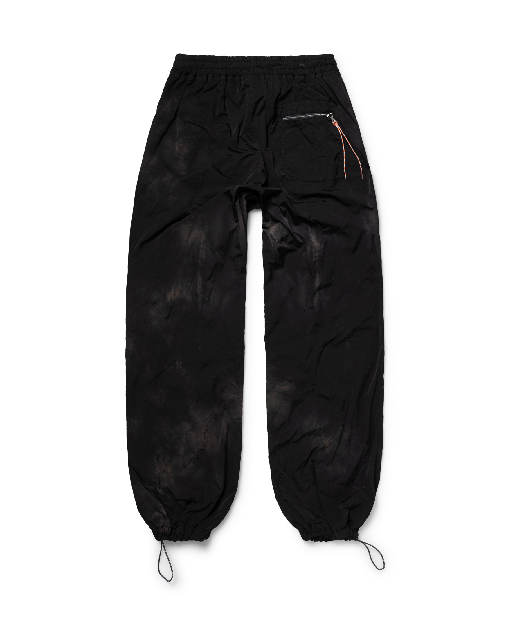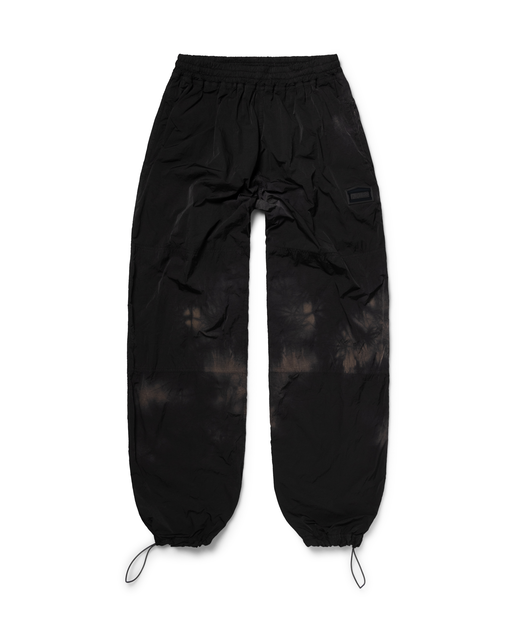 Unisex lightweight nylon track-pant with elasticated waistband, ankle toggles, reinforced knees and zip patch pocket on the back. With vintage flat-lock stitch detail and silicone temple patch. Finished with a rag dye treatment.
