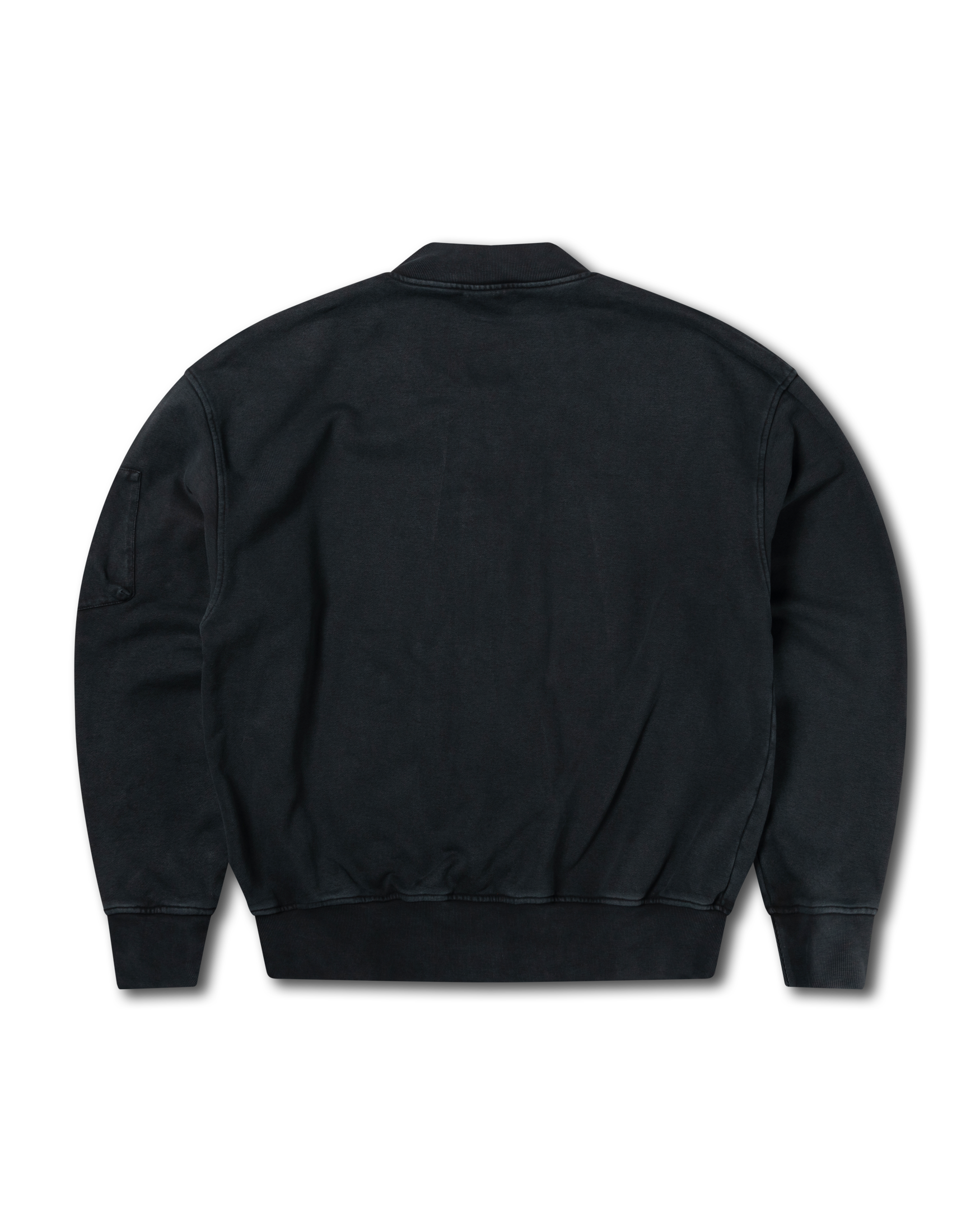Cross-grain sweat zip-through bomber, made in heavy cotton jersey fleece, featuring bomber-style left sleeve zip pocket, 2 large front pockets and a 2-way Roman Coin Zip front. Featuring a Classic Aries Temple screen print on chest and finished with a faded vintage look.