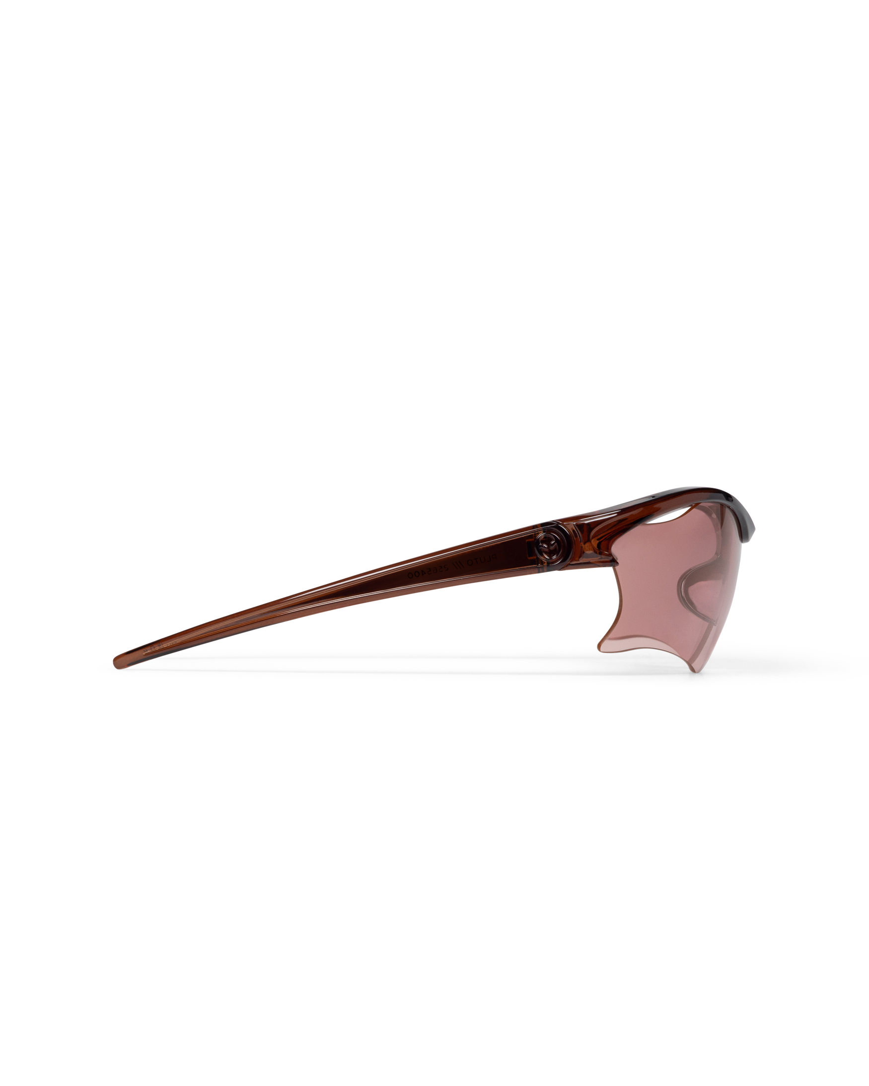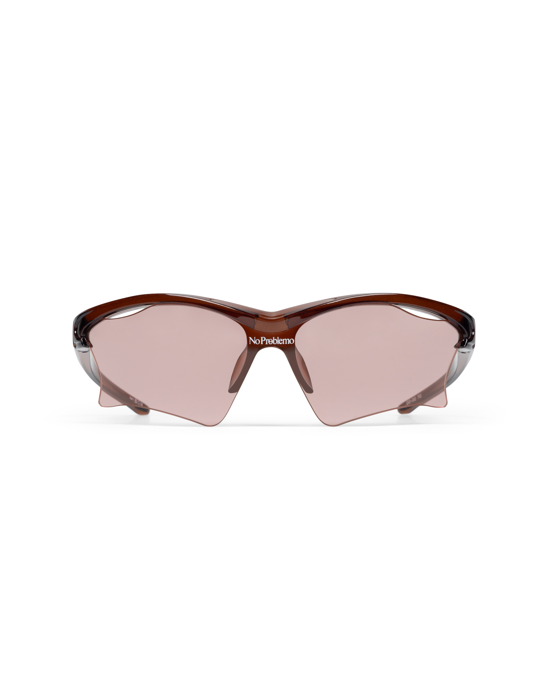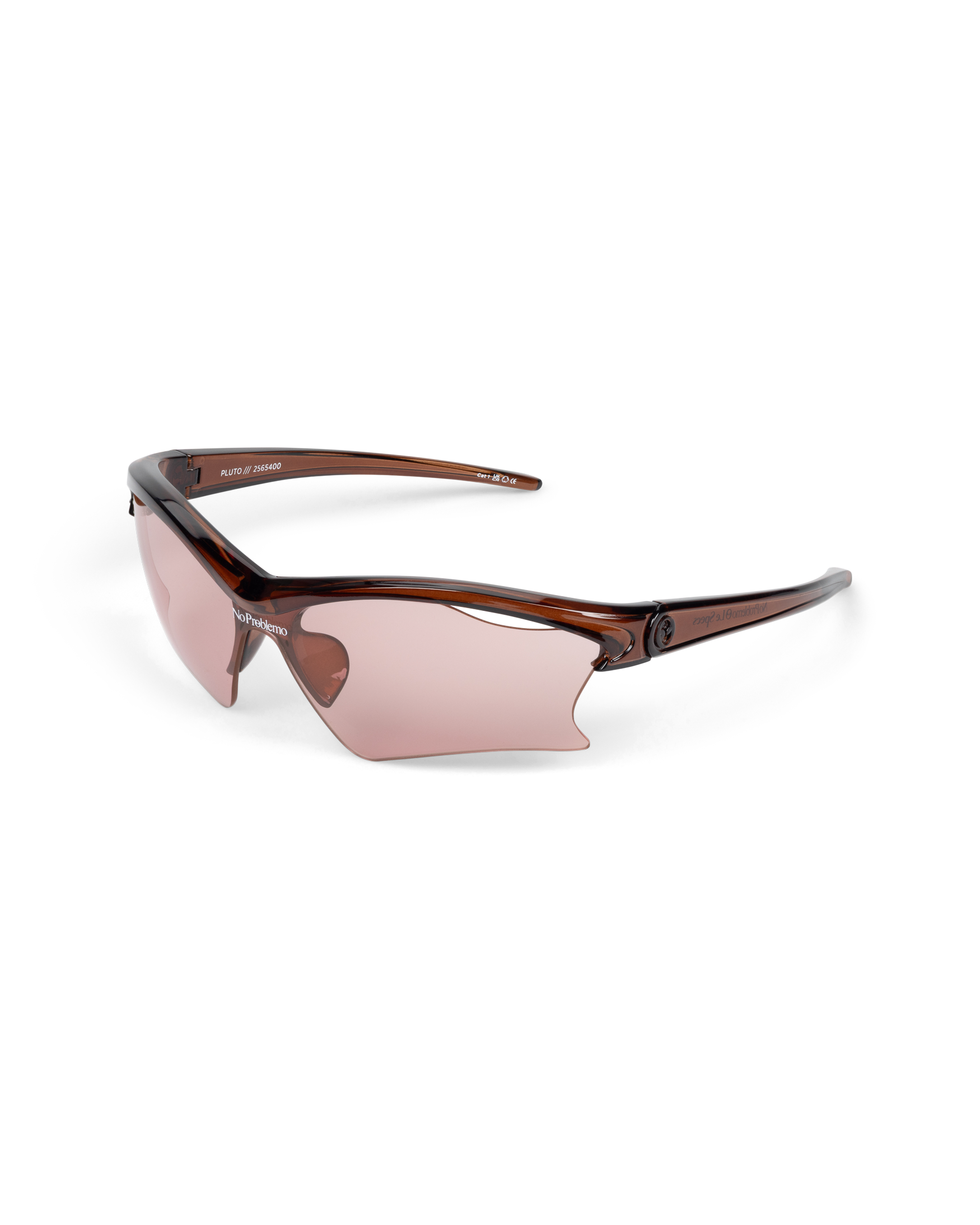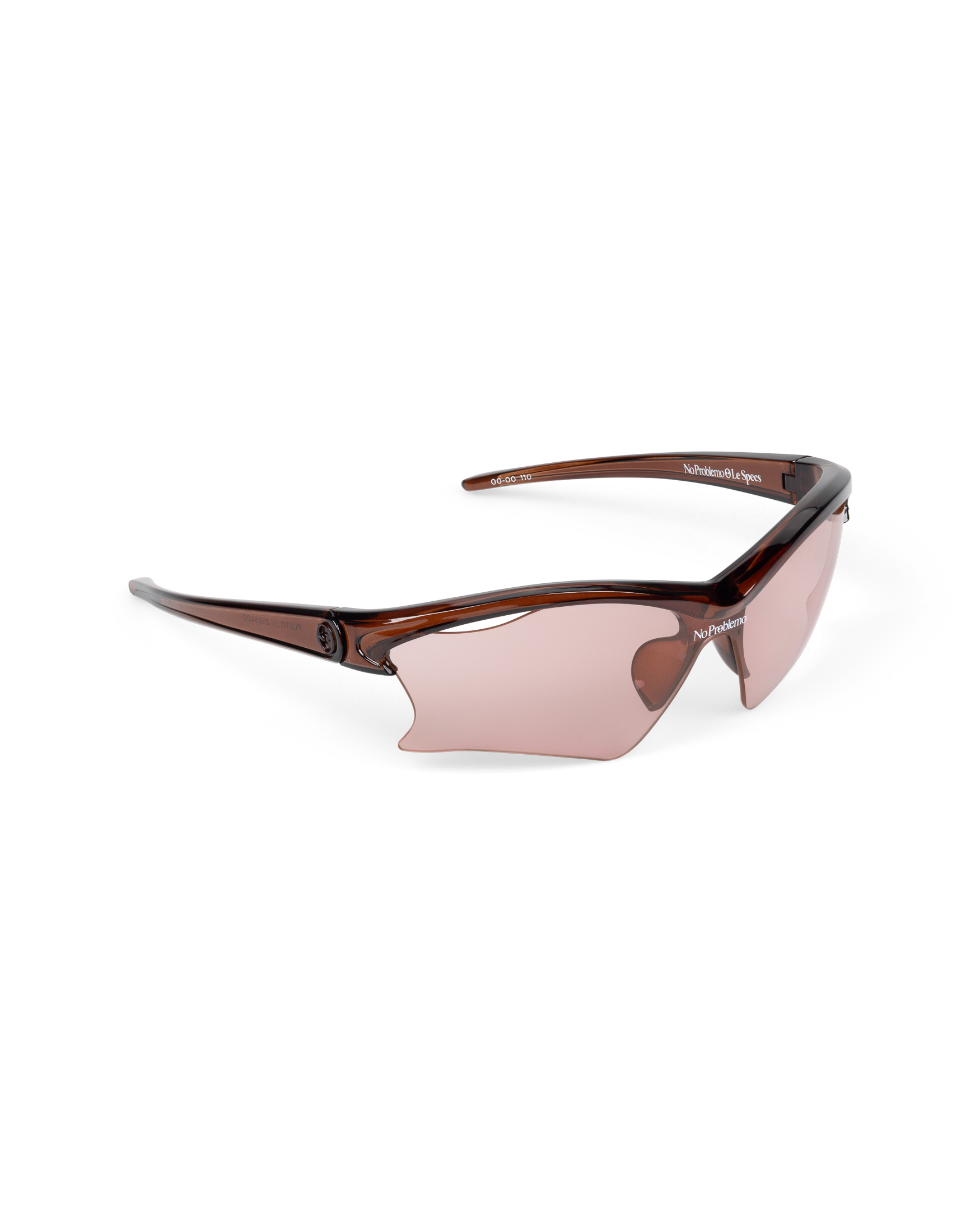 designed with sleek and sweeping proportions, the pluto wraparound semi rimless shield sunglasses are a modern update on the early 2000s racer style. featuring cut out lens accents and three dimensionally moulded frame profile with signature alien head motif embossed into temple, this frame is finished with signature no problemo logo lens print to centre front and tapered tubular temples for a comfortable fit.