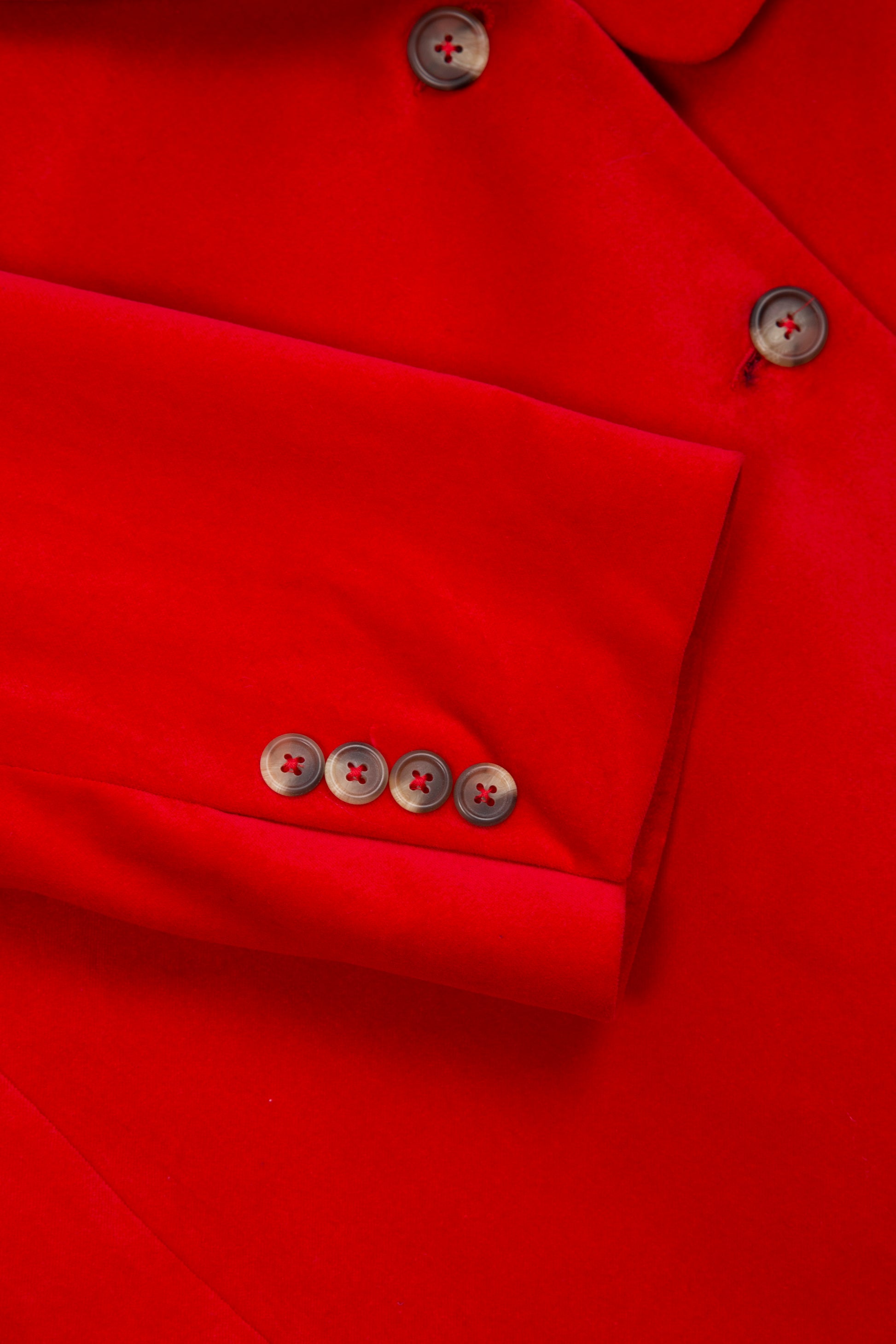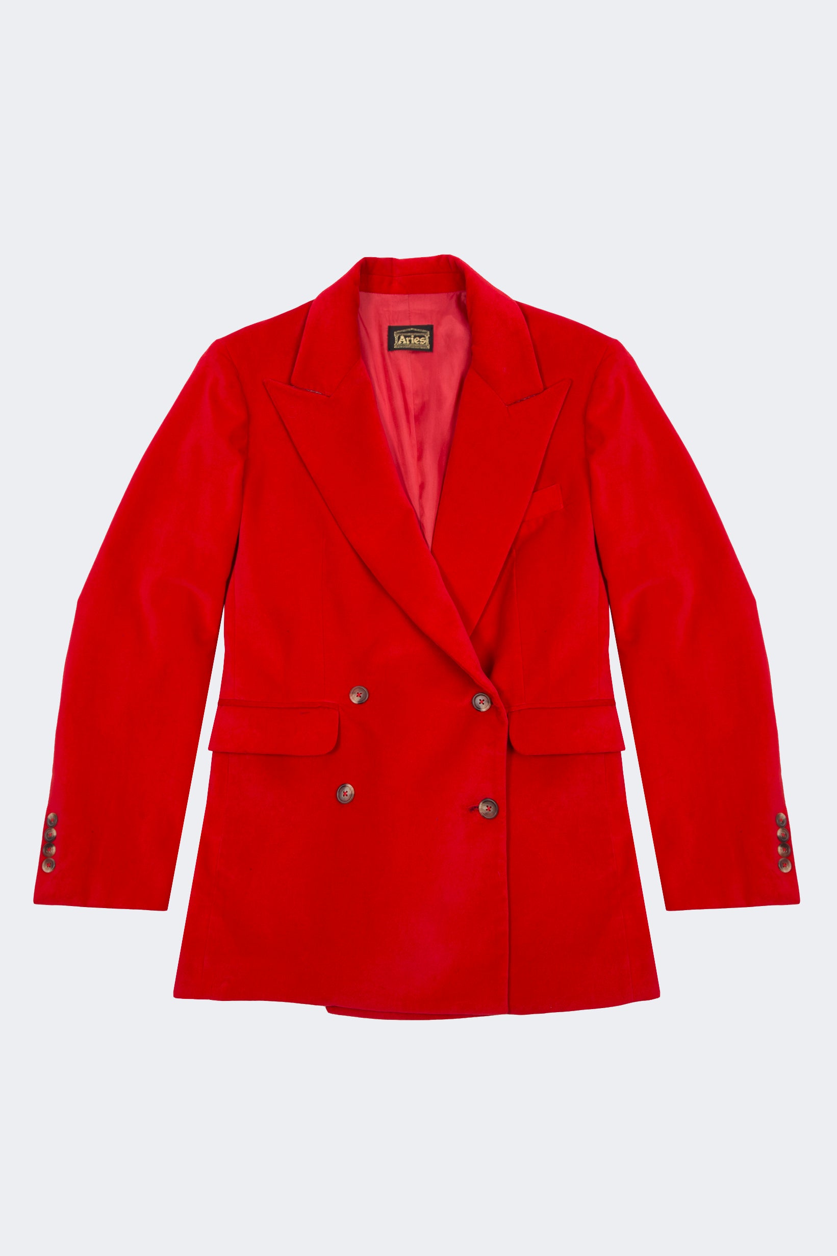 Our boxy, 80s-cut double breasted jacket, in a plush red cotton velvet. Features an internal pocket with fluro zip detail.
