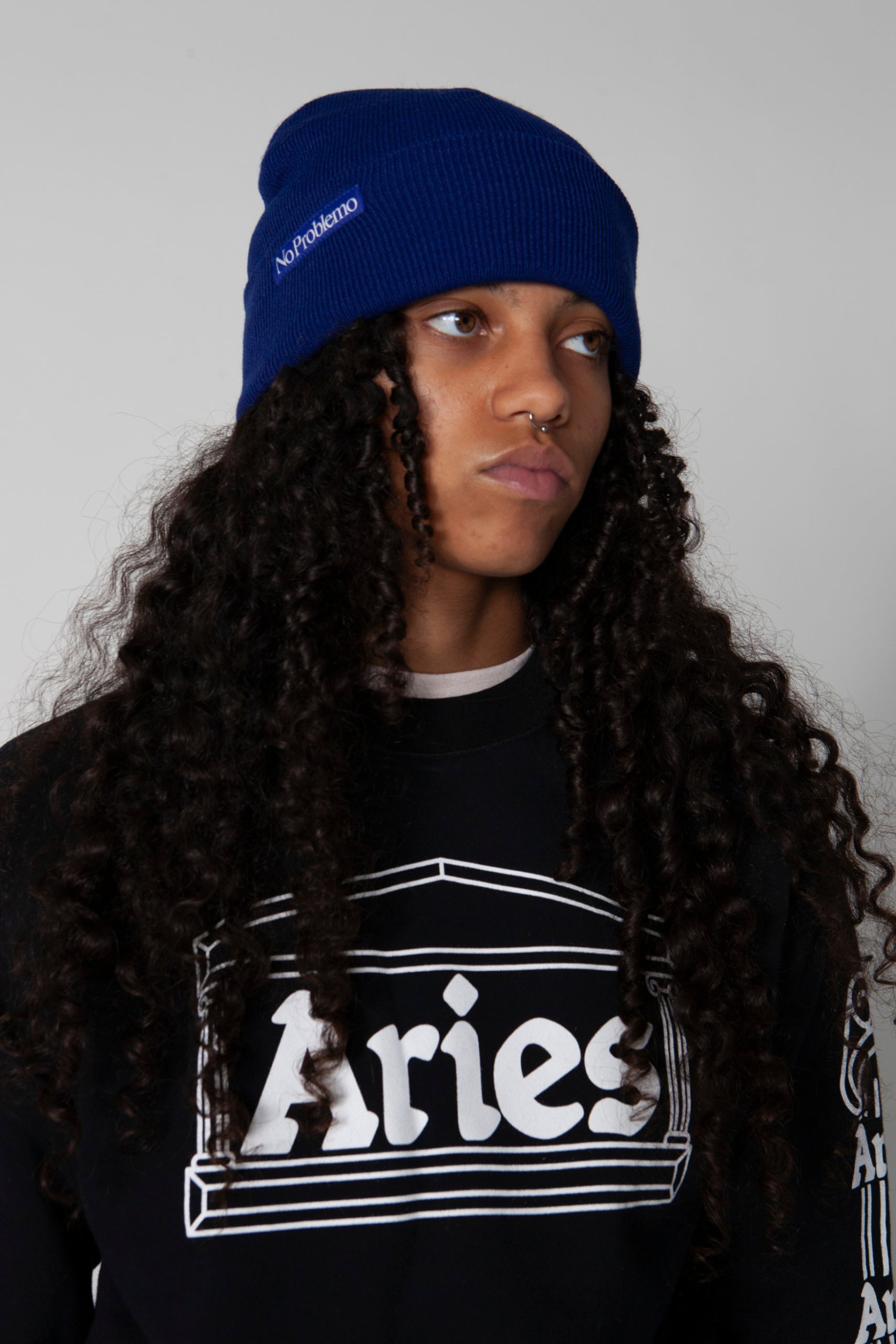 Flat-knit acrylic beanie with a turn-back and woven mini No Problemo logo patch.