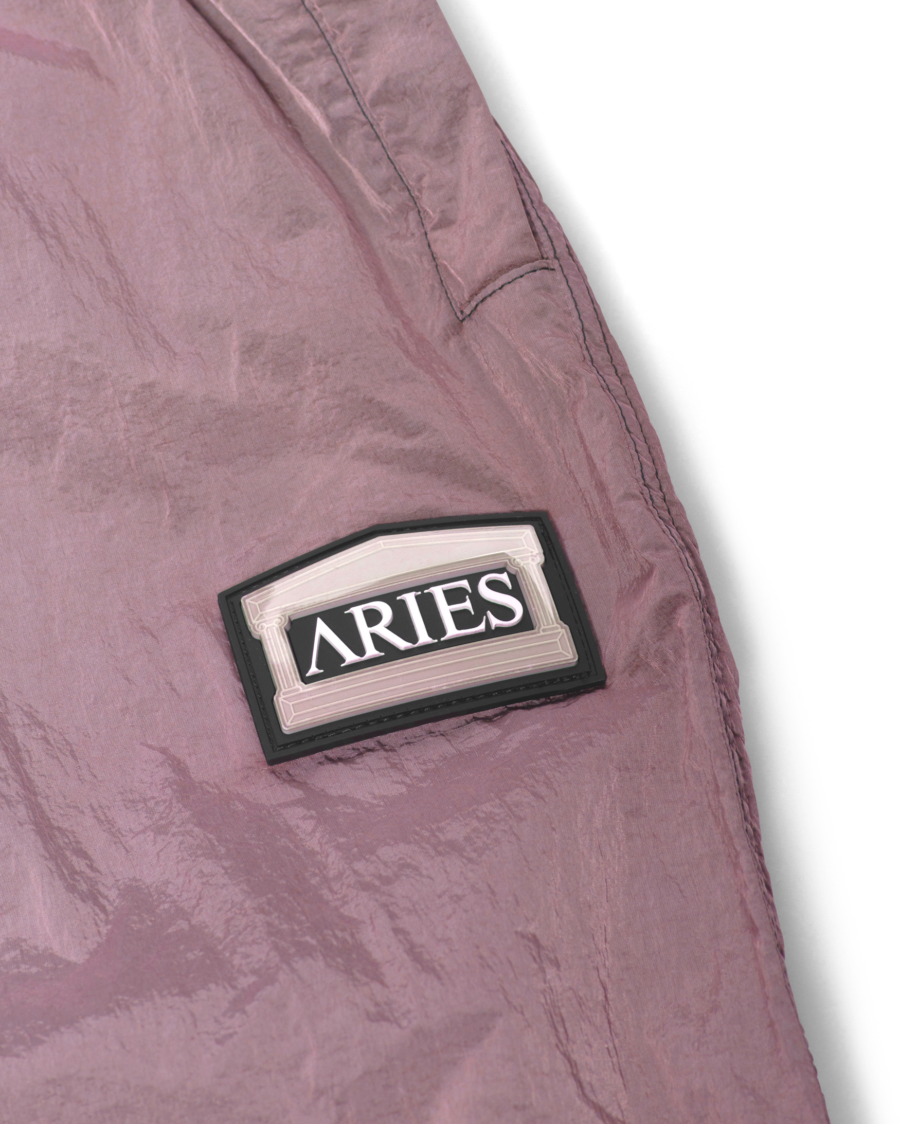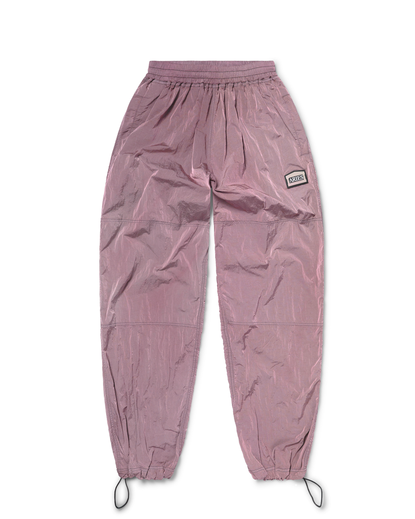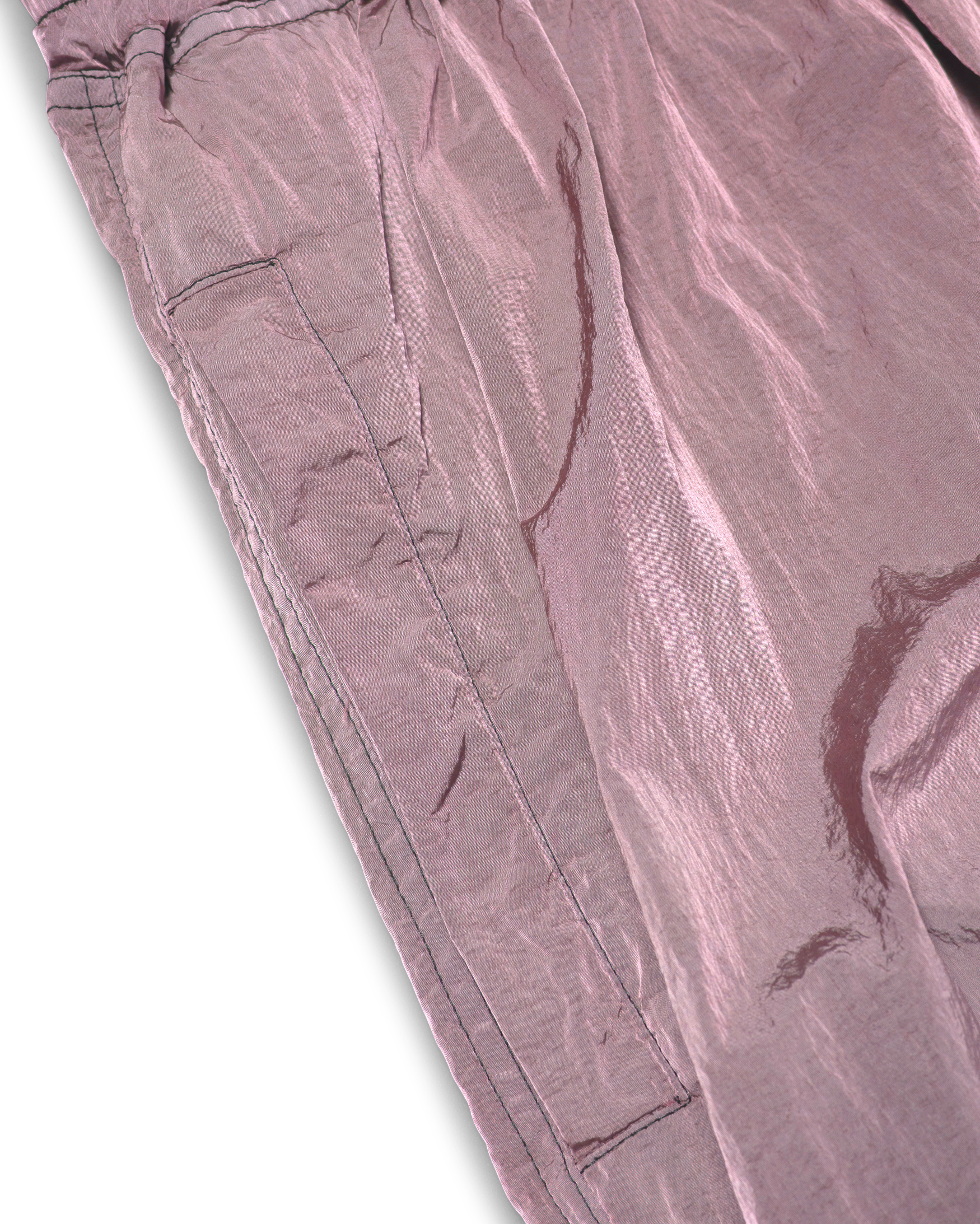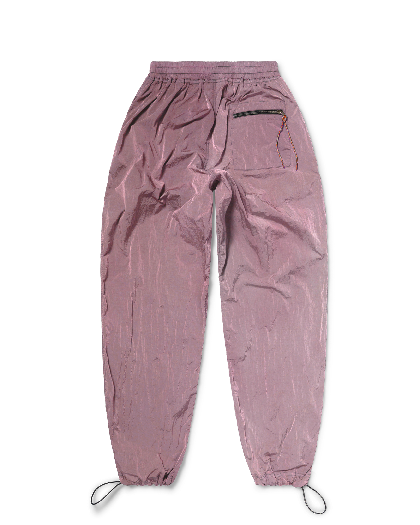 Unisex lightweight nylon track pant with elasticated waistband, ankle toggles, reinforced knees and a zip patch pocket on the back. With vintage flat-lock stitch detail, and a patchy garment dye finish.