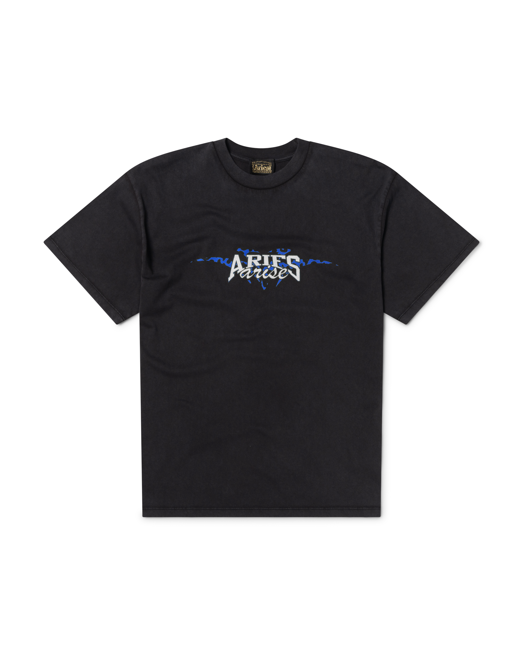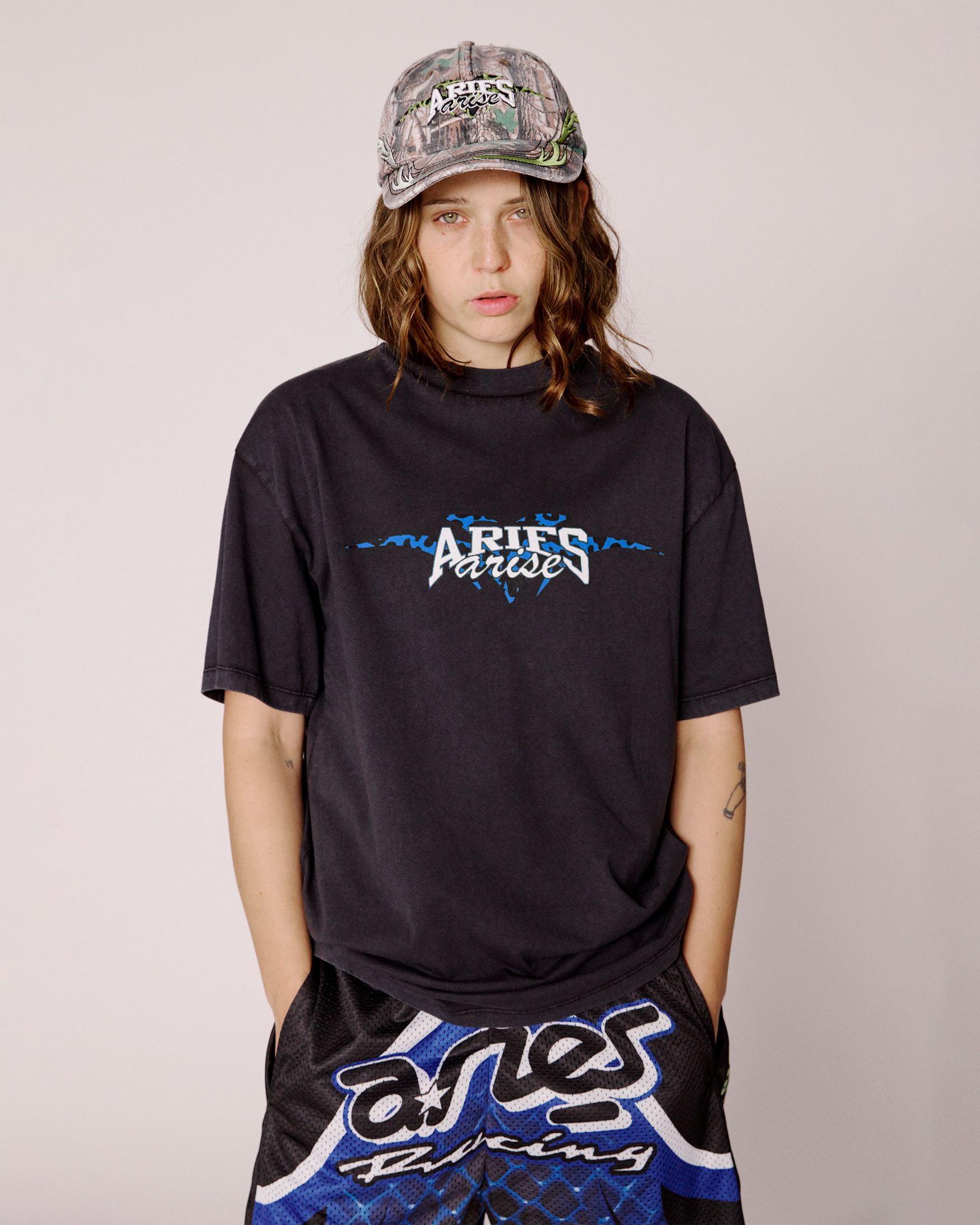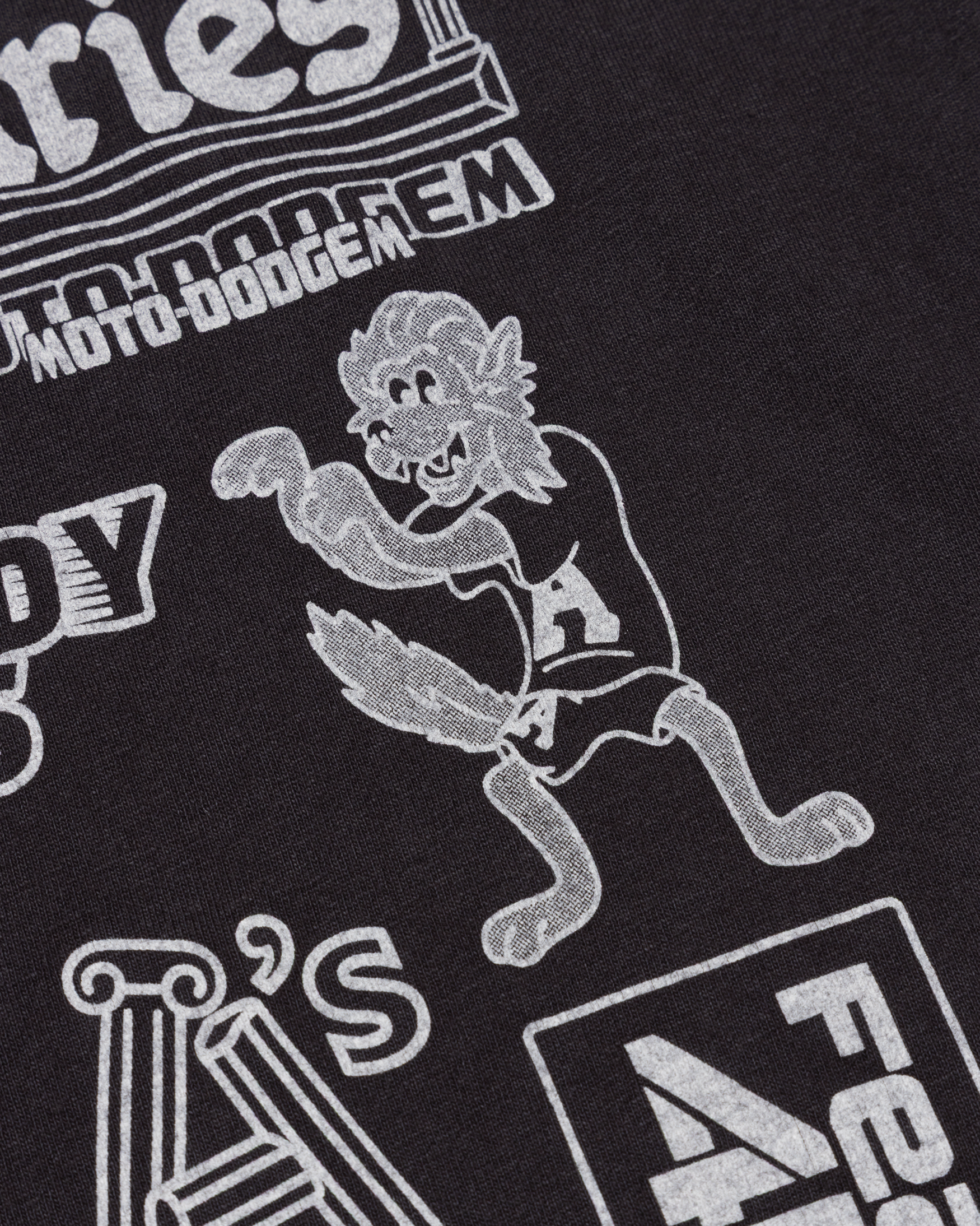 unisex short sleeve t-shirt from the aries end. exclusive capsule, made from 100% cotton in a mid-weight open-end jersey. detailed with ‘aries moto-dodgem’ graphics screenprinted front and back, and finished with a stone wash for a soft, faded look. available in white and black.