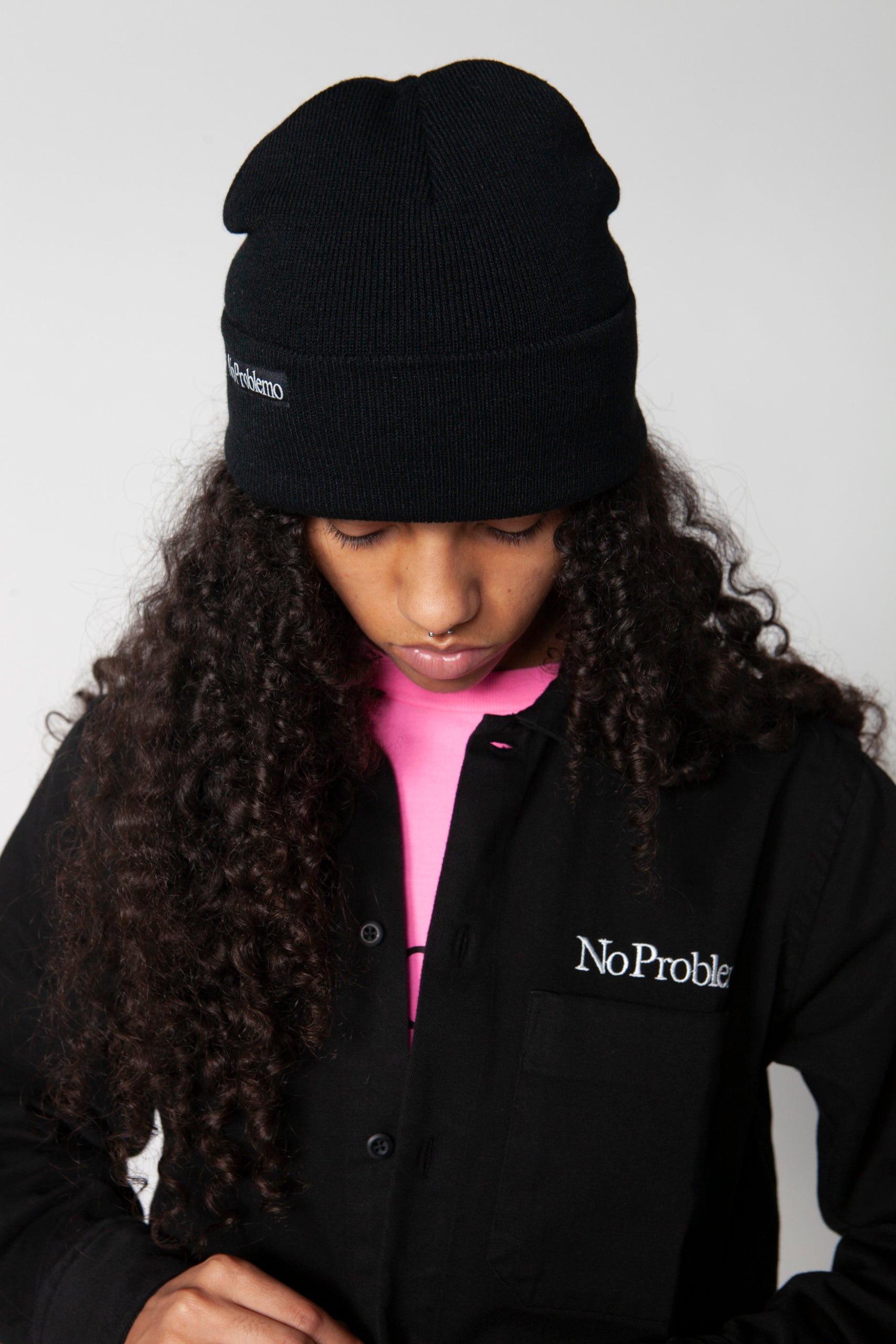 Flat-knit acrylic beanie with a turn-back and woven mini No Problemo logo patch.