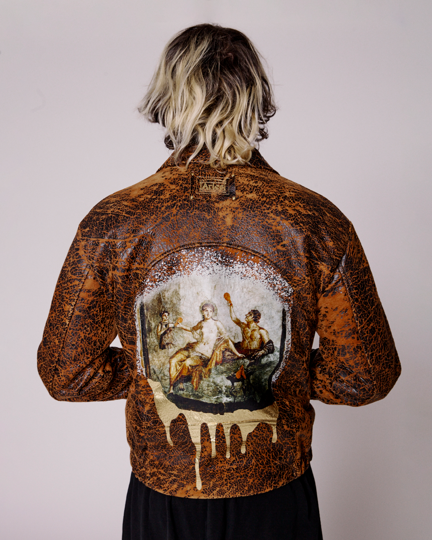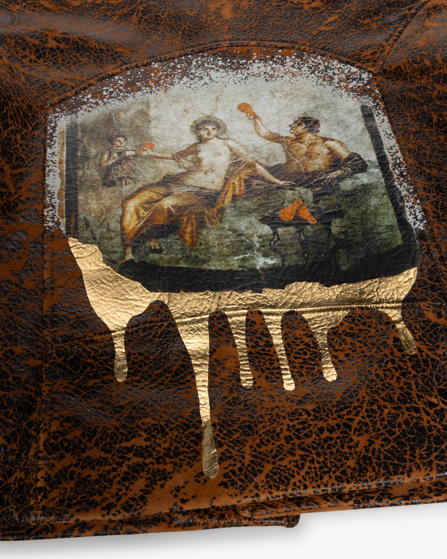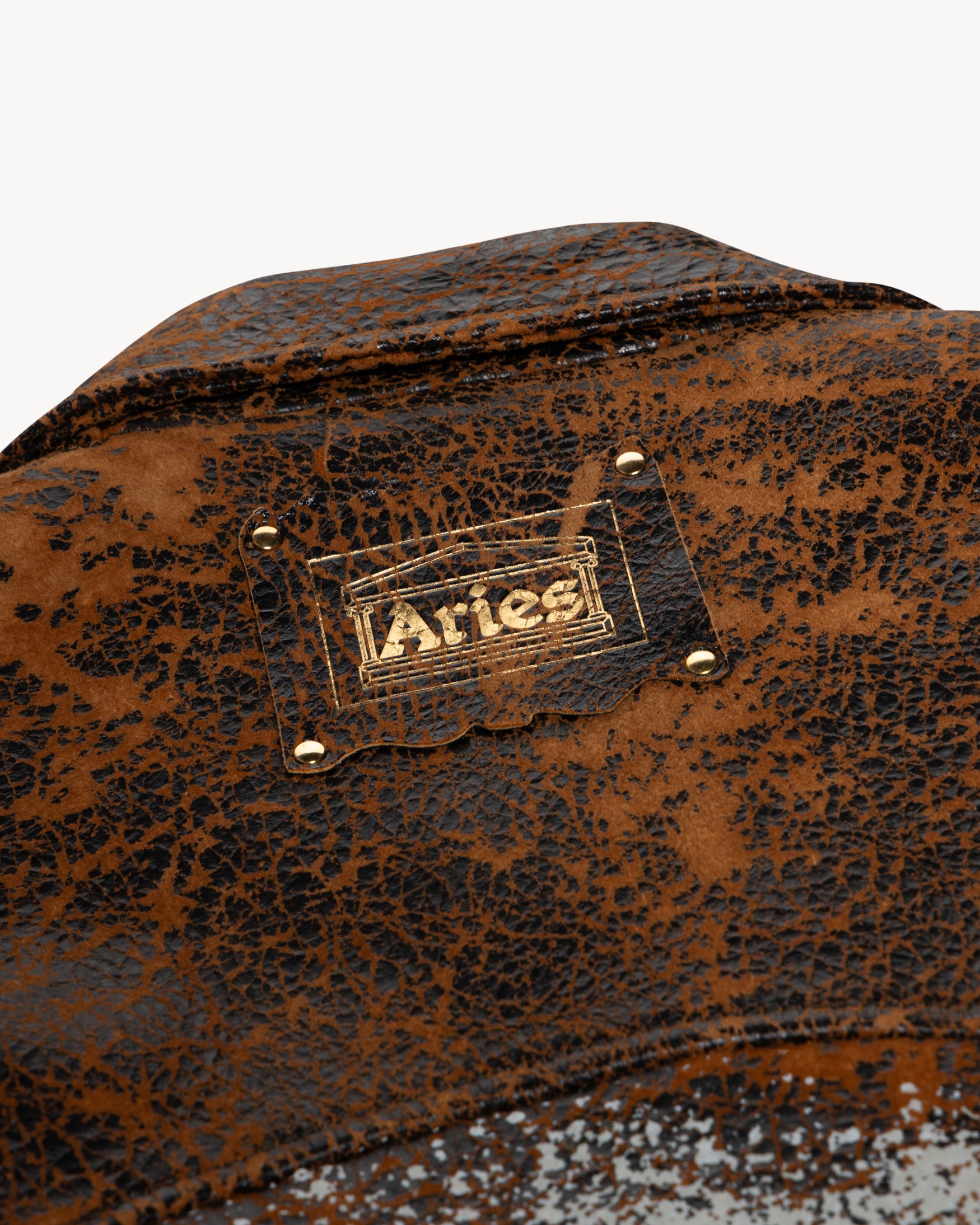 Premium coach jacket with classic Western-inspired detailing, crafted in distressed lamb leather for a vintage-effect finish. Features an Aries x KFC Temple Drip logo on the front and a full-colour fresco graphic across the back, combining matte ink with gold foil accents for a rich, textured look.