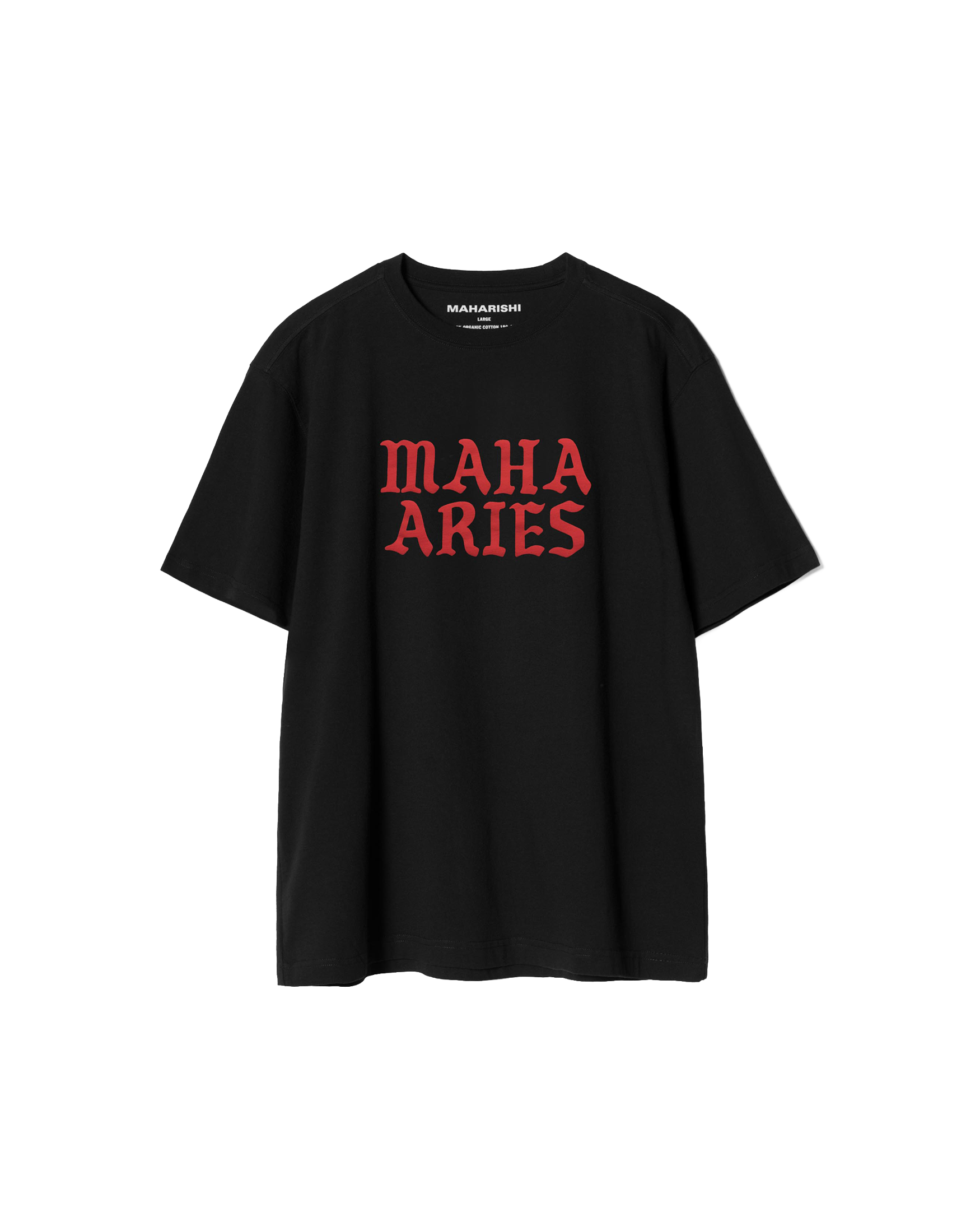 Made from 100% cotton, the design features “MAHA ARIES” in Maharishi’s custom Mack lettering, developed from historic blackletter forms spanning medieval Gothic scripts to early basketball jerseys and band merchandise.
