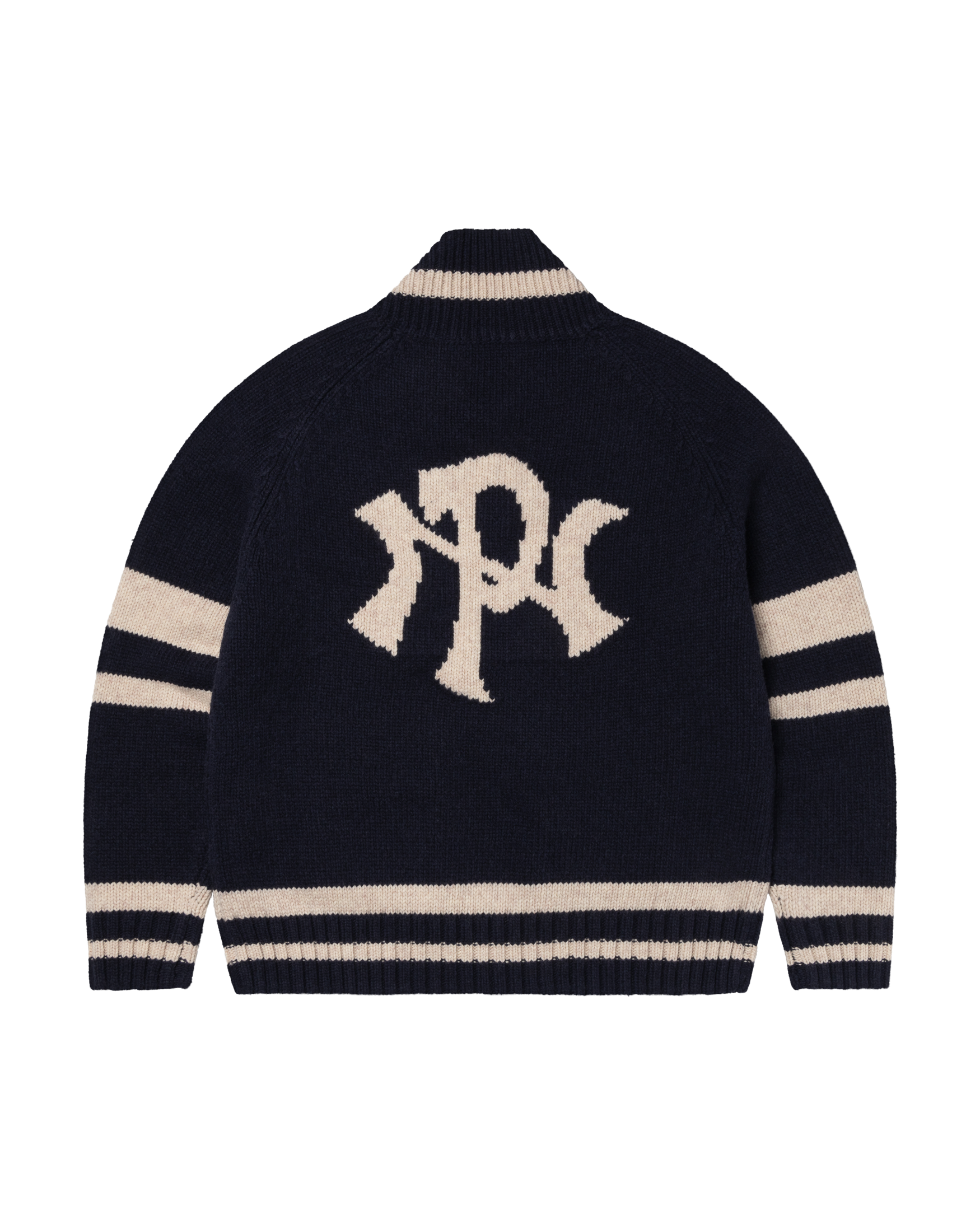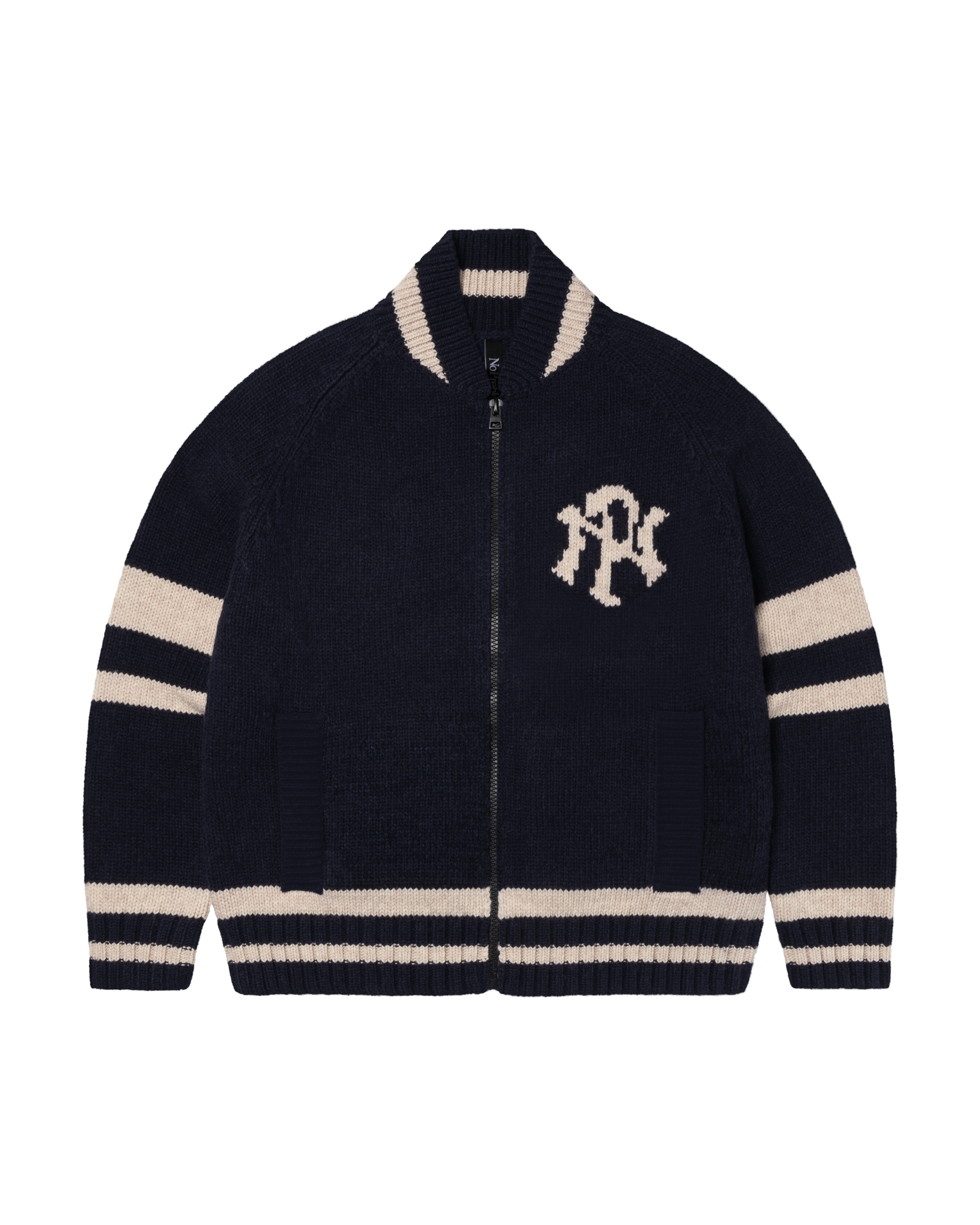 zip-through collegiate-style chunky knit in wool mix yarn.