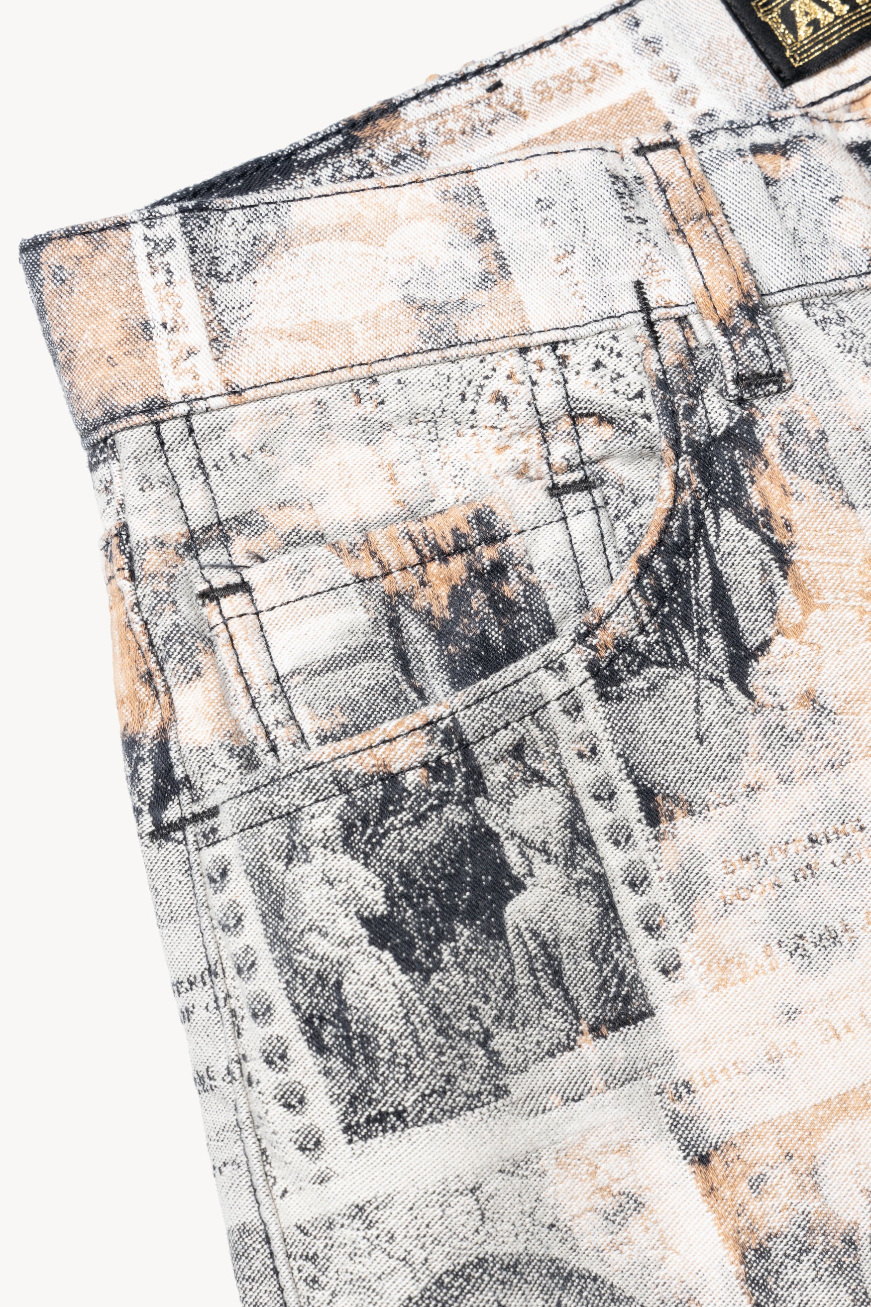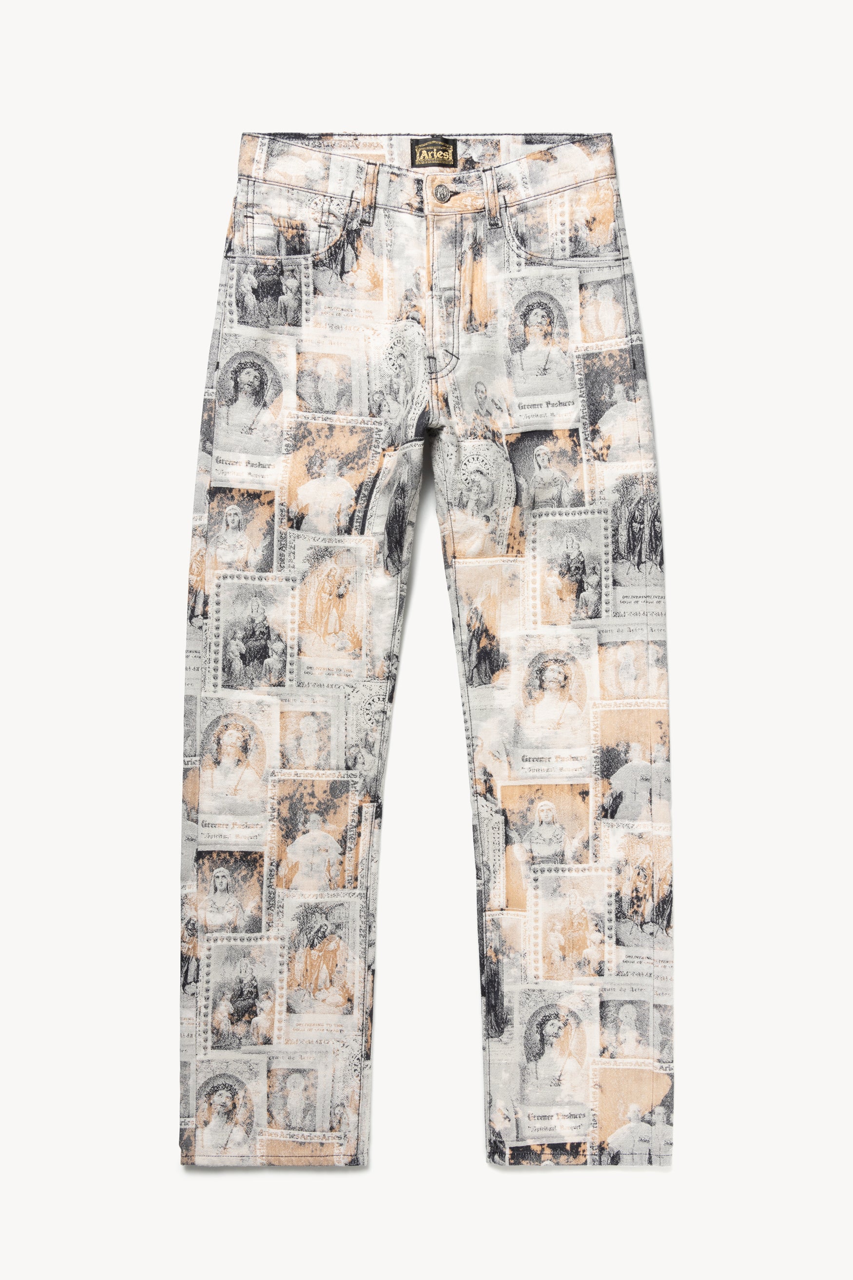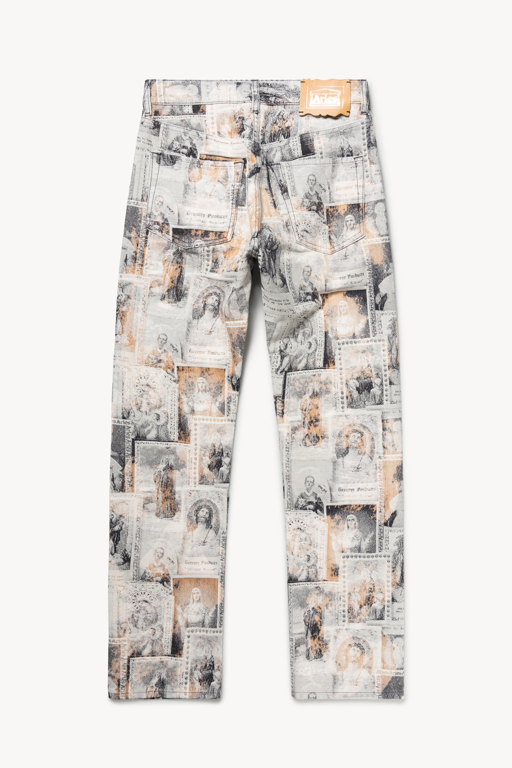 Unisex Lilly jean made from a custom jacquard 100% cotton denim which features an allover saints card design. Our favourite unisex classic-cut jeans that look great tight-fitting or baggy. True straight leg with a high rise and button fly. Sized to conventional men’s sizing. Treated with a patchy acid wash treatment. Made in Italy.