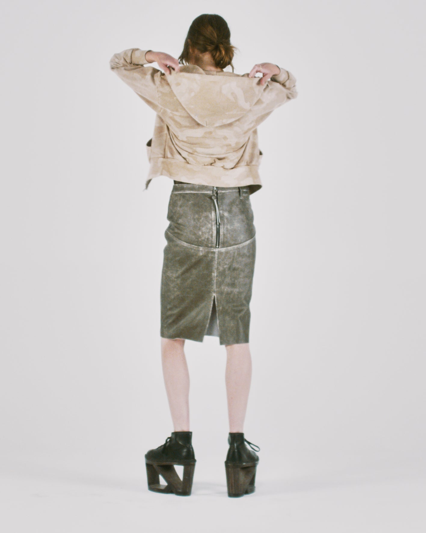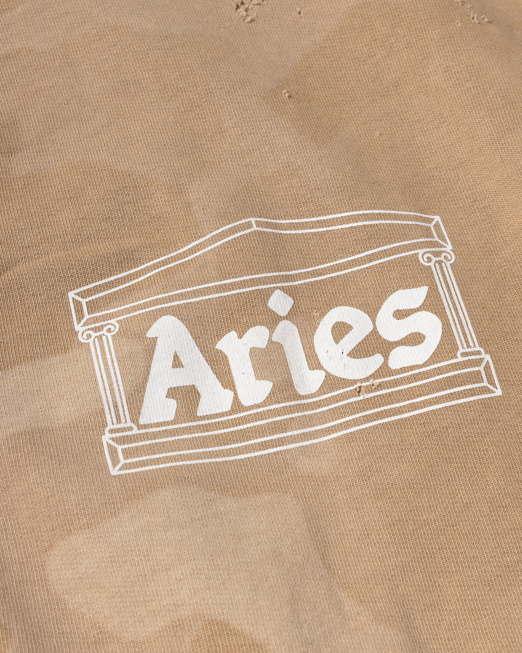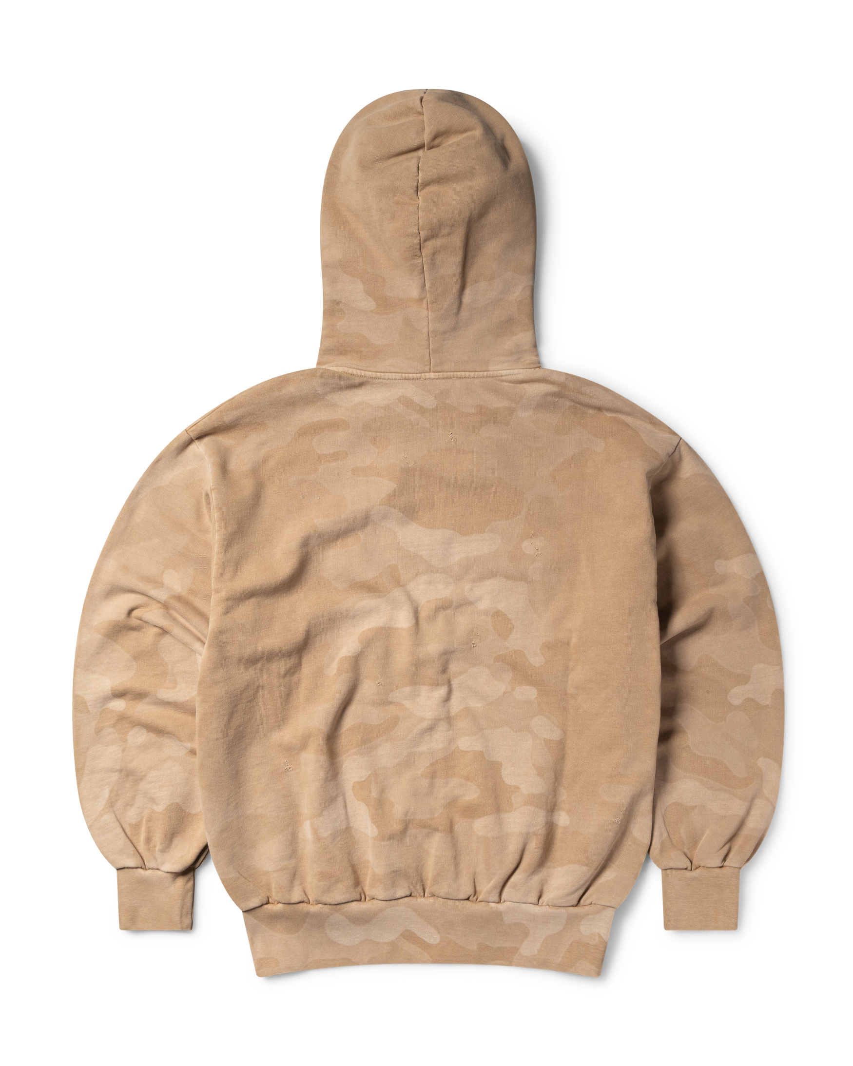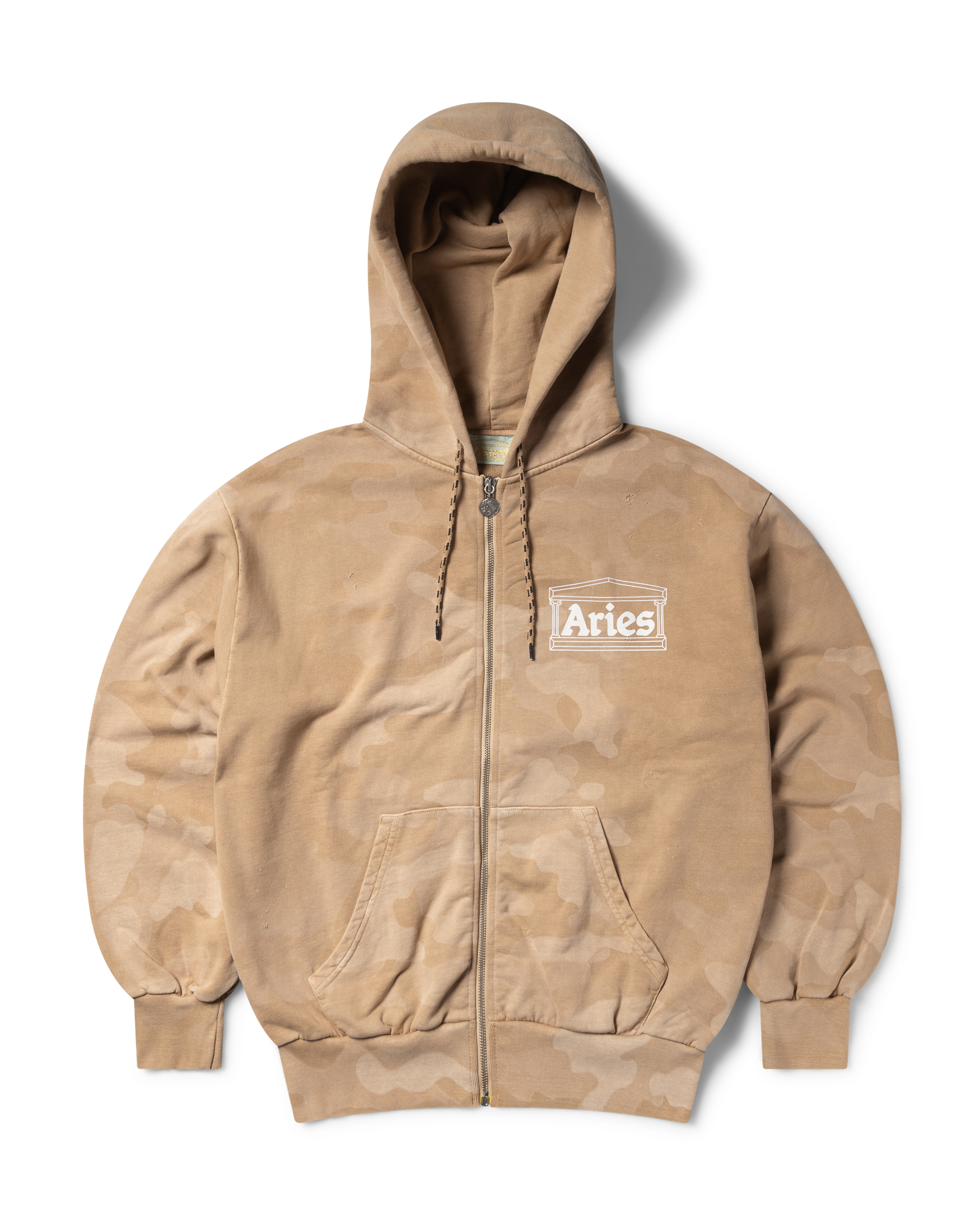 Unisex zip through hooded sweatshirt made from loop-back 100% cotton jersey fleece. With a camo laser treatment and Aries Classic Temple on the chest and Roman Coin zip front, destroyed with a heavy wash treatment for an aged look.