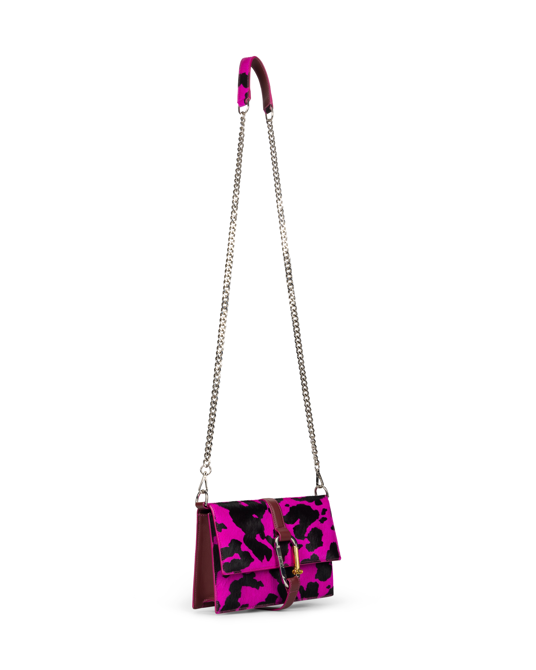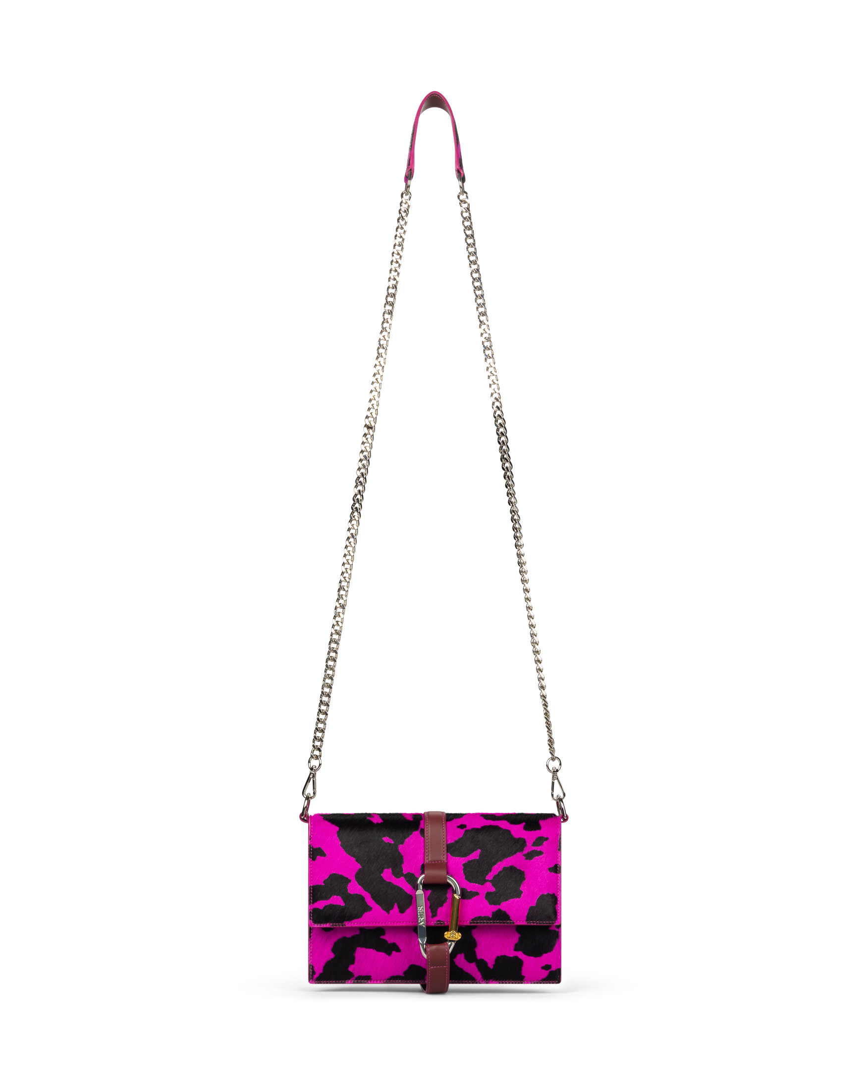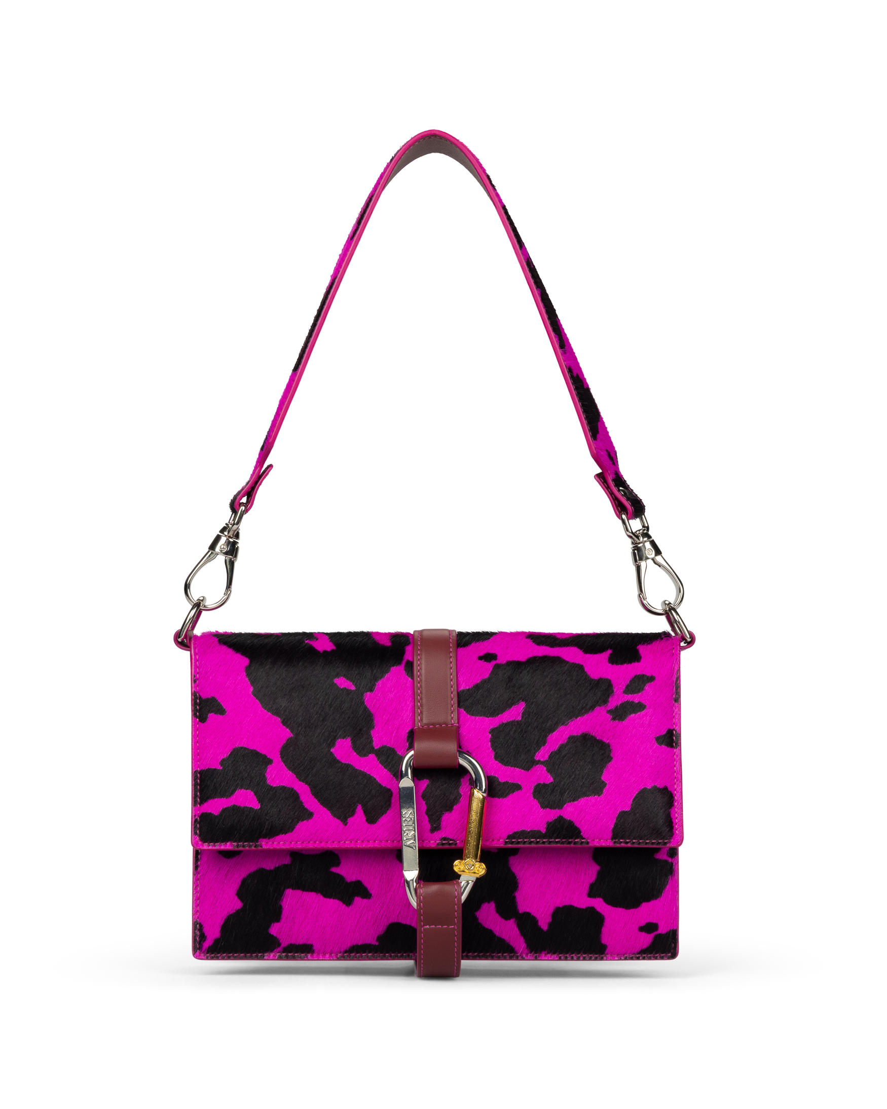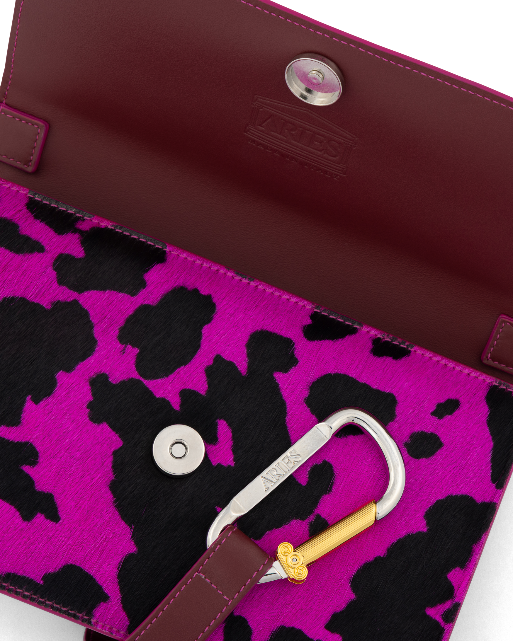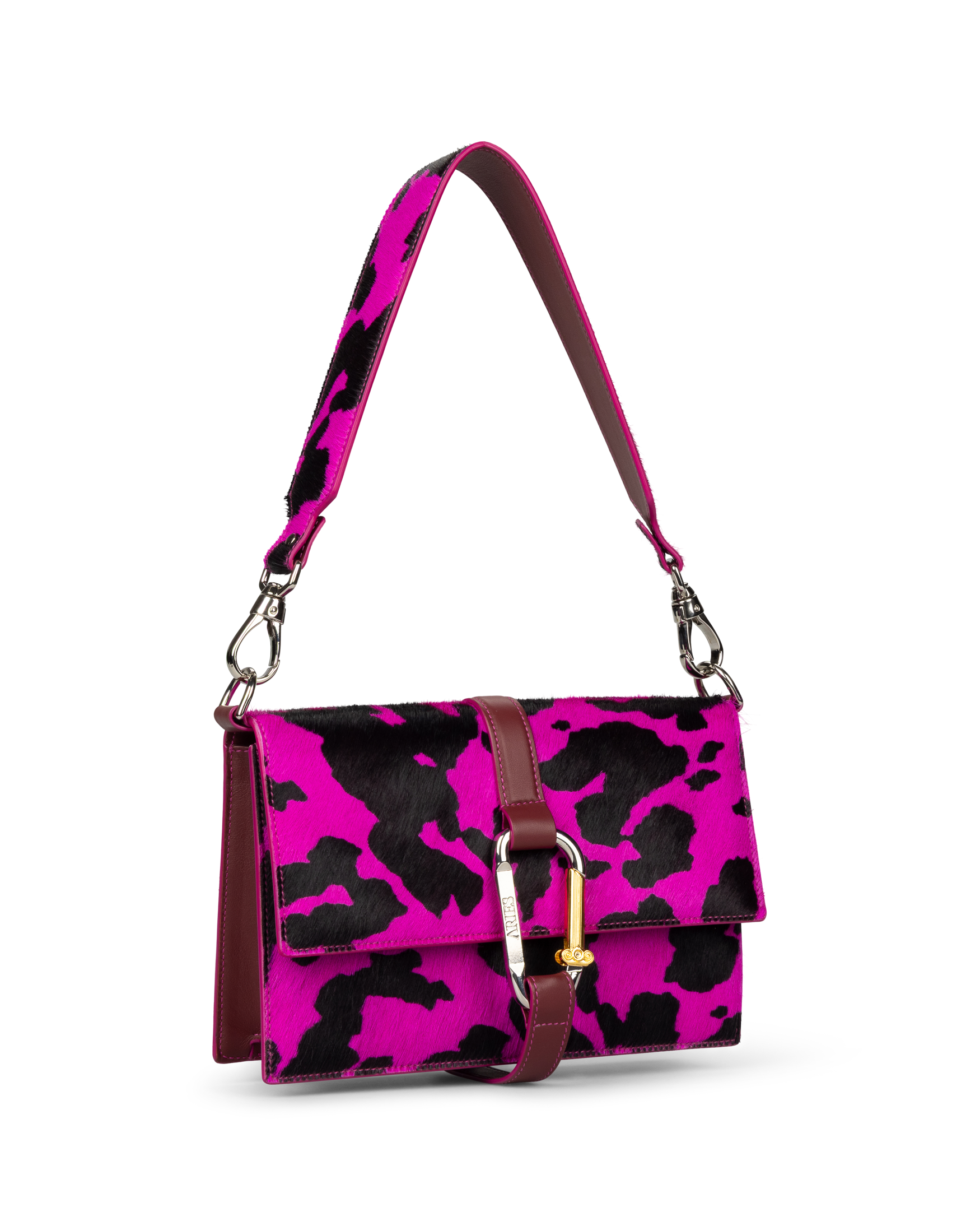 Ponyskin Kasper Bag with an all over cow print. 100% cow leather. With Aries Column Carabiner, Aries Temple print.