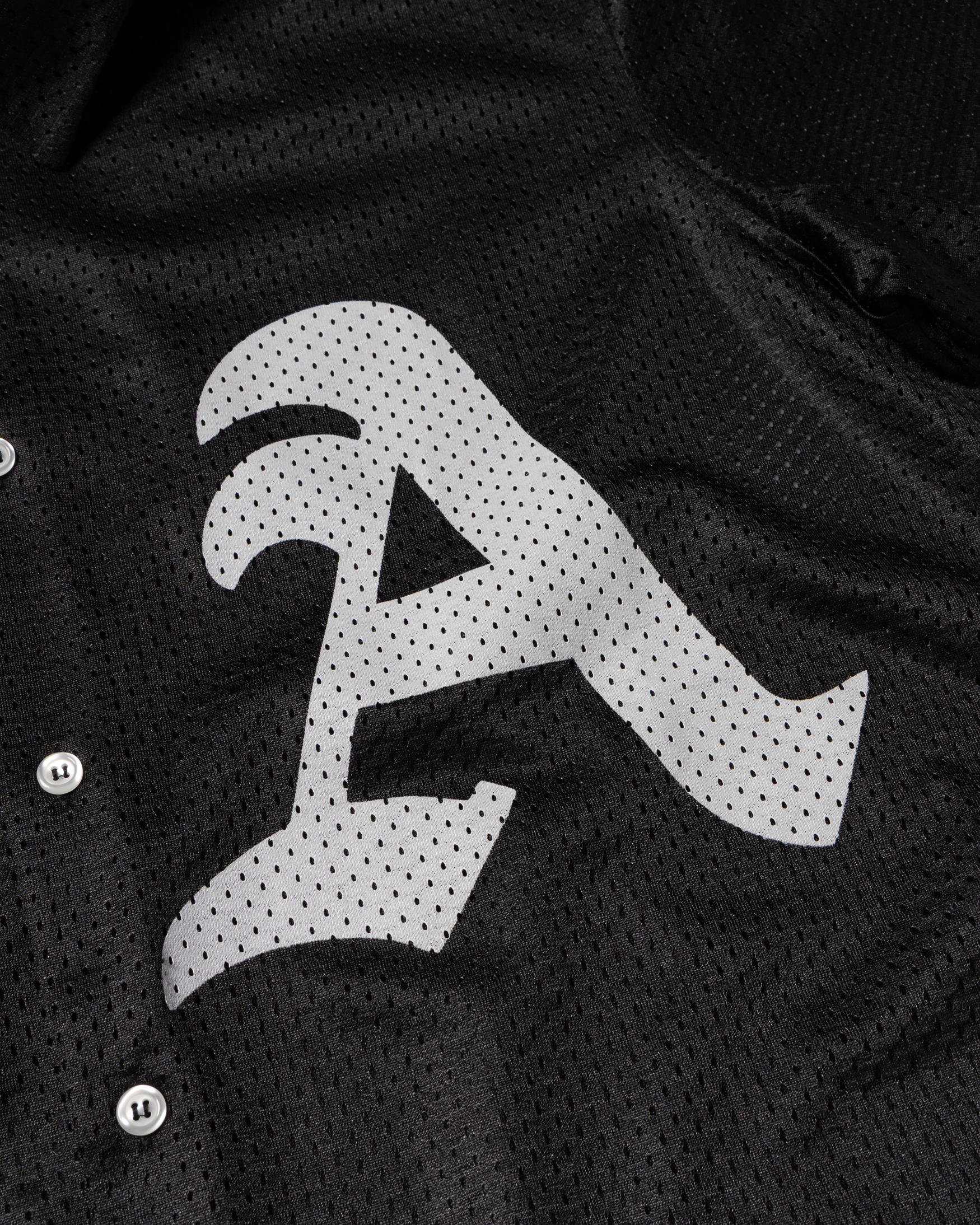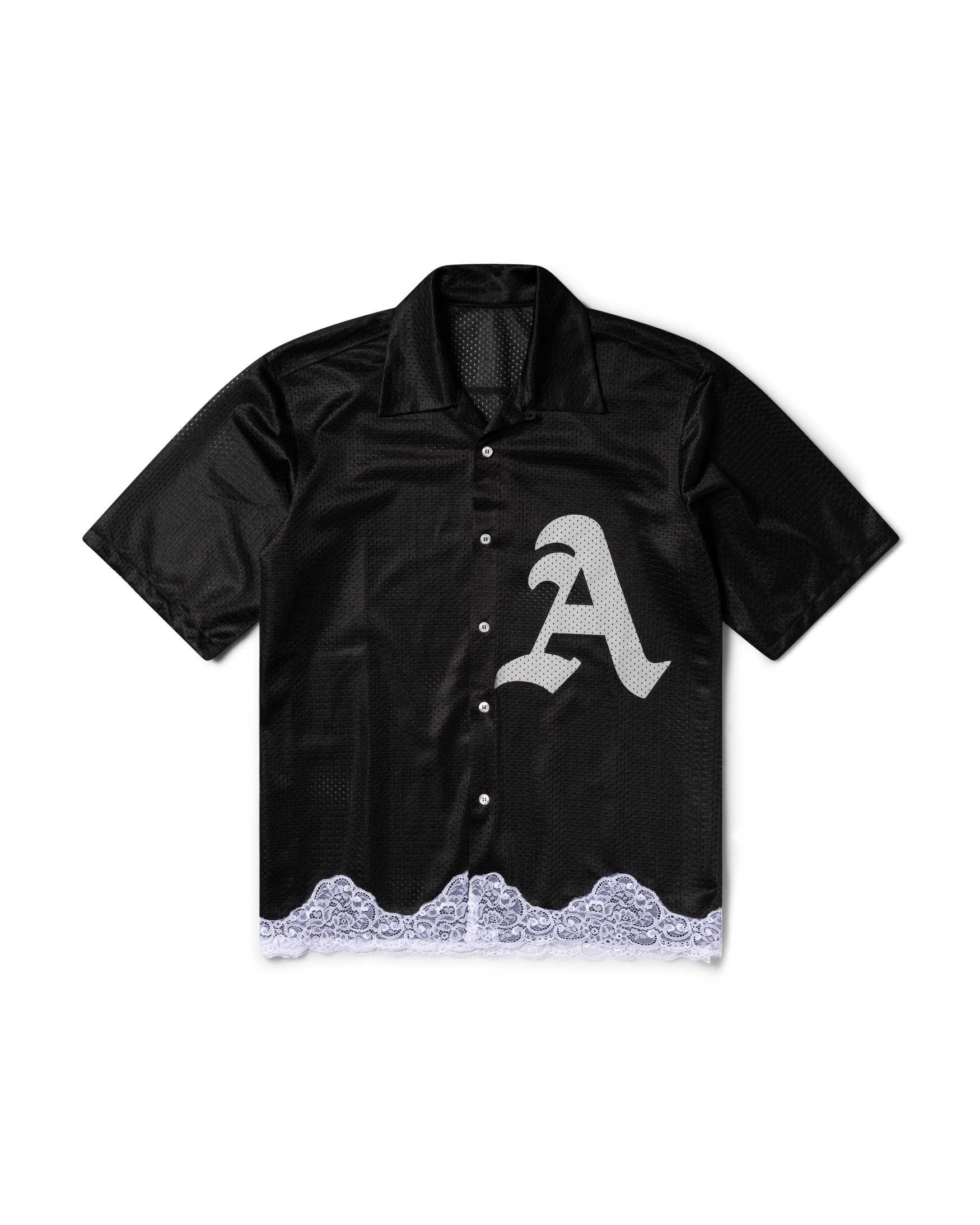 Unisex short-sleeved Hawaiian shirt in double layer shiny airtex fabric with a contrast lace trim at the hem. Featuring Aries Gothic A print on the wearer's left side.