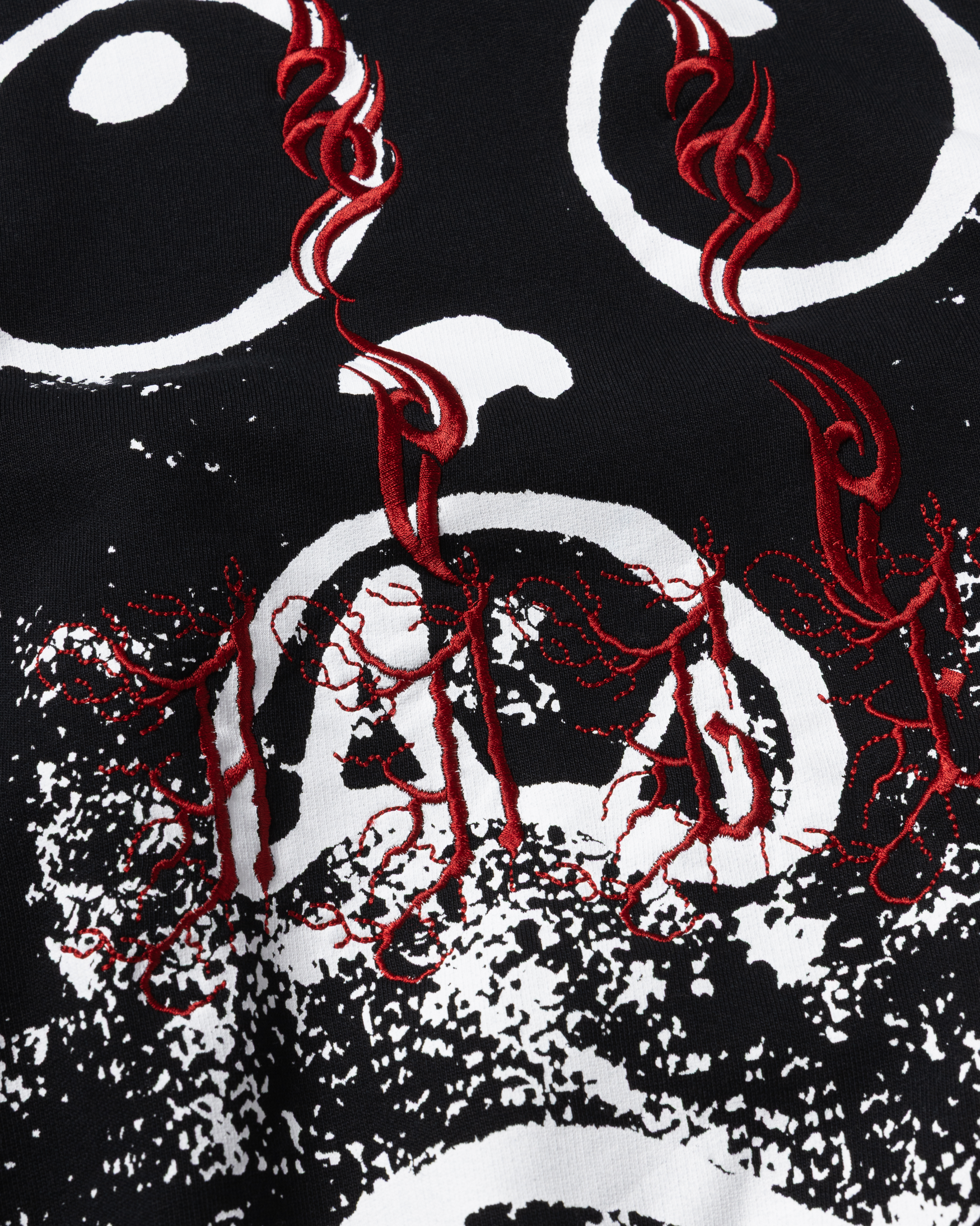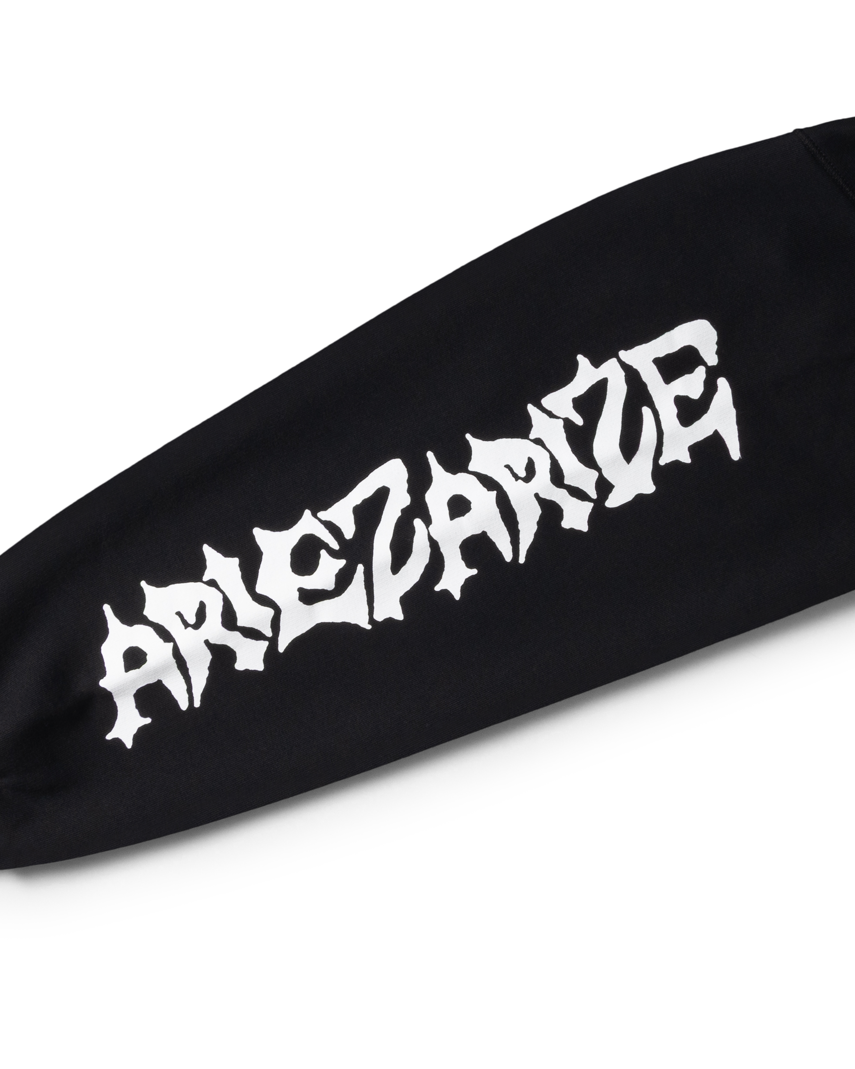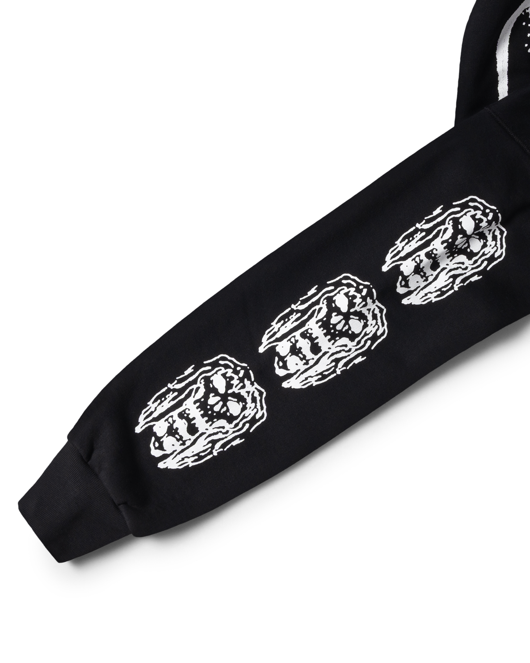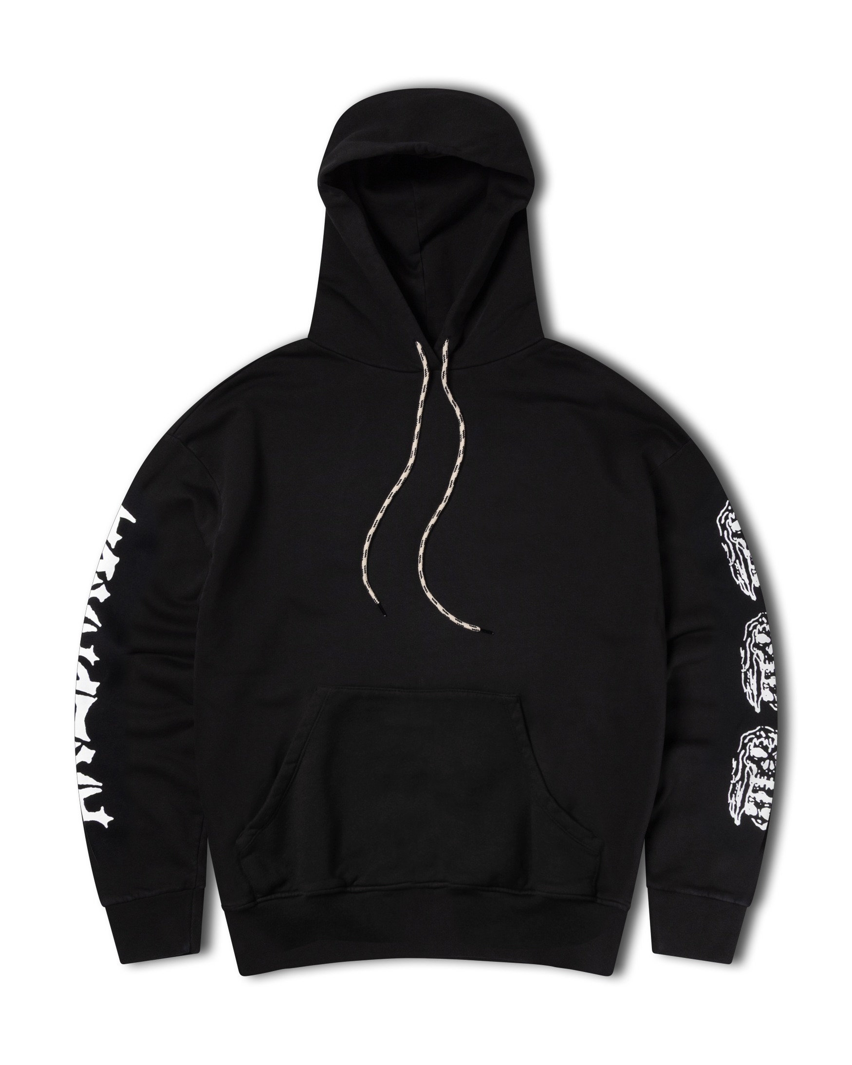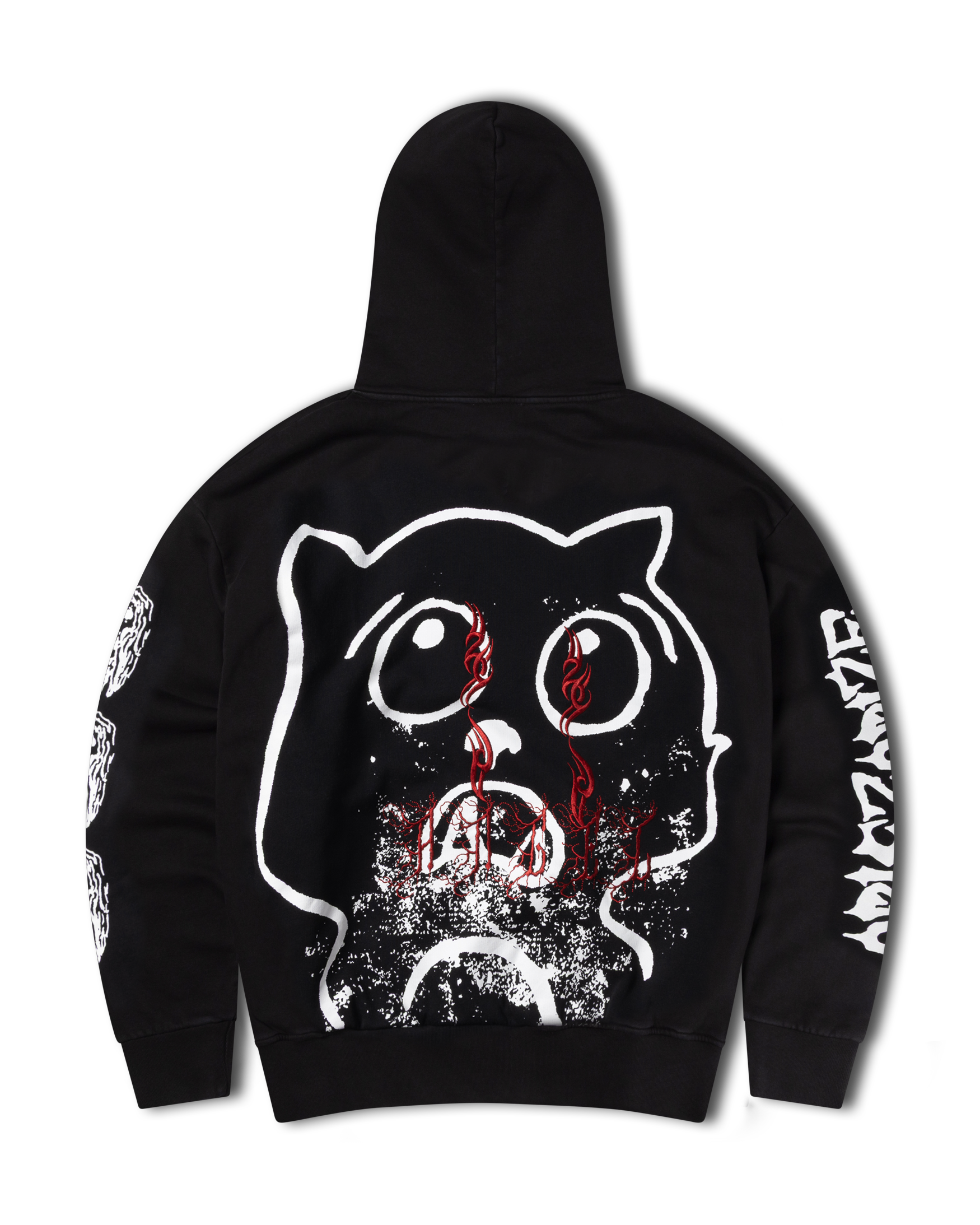 Hooded sweatshirt made from brushed-back 100% cotton jersey fleece, with Meowharishi Cat Face screen print on the back with embroidery on top, Zombie & Aries Zine graphics screen-printed on the sleeves and Classic Temple on the chest.
