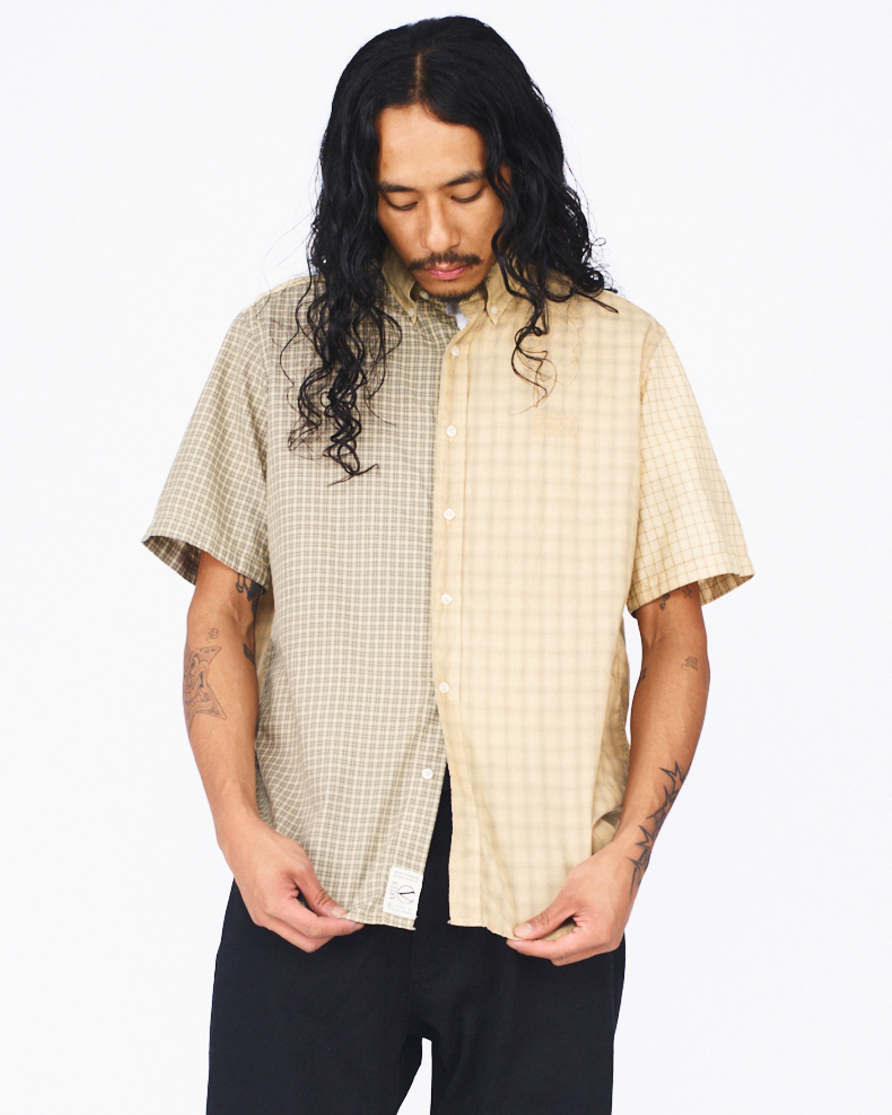 Short-sleeved shirt with button down collar in a patch-worked check design with embroidered Aries Temple logo on wearer's left chest. Beige colourway is overdyed.
