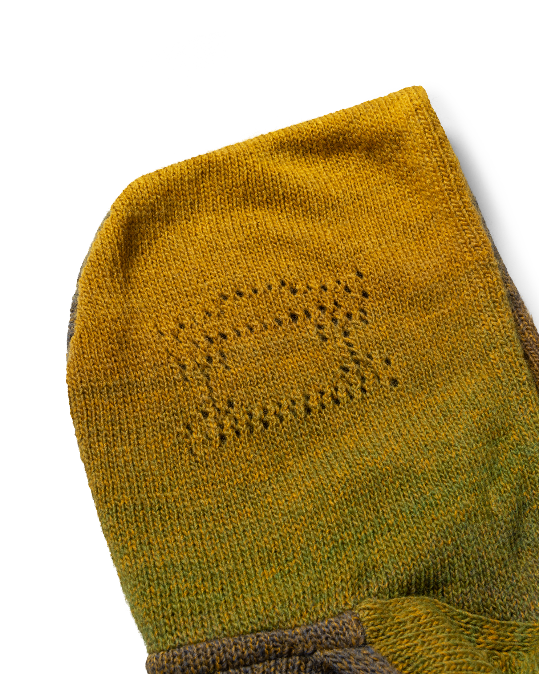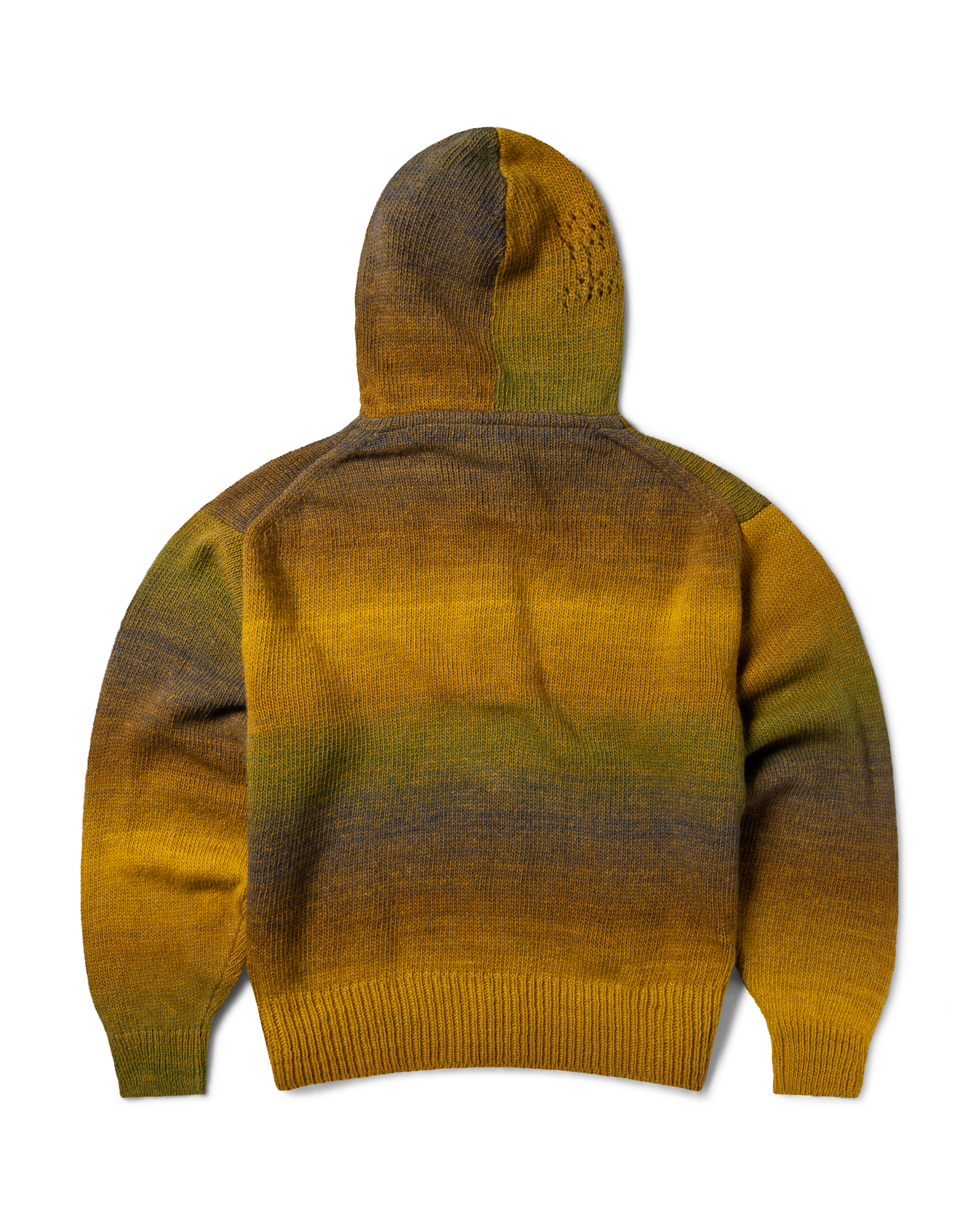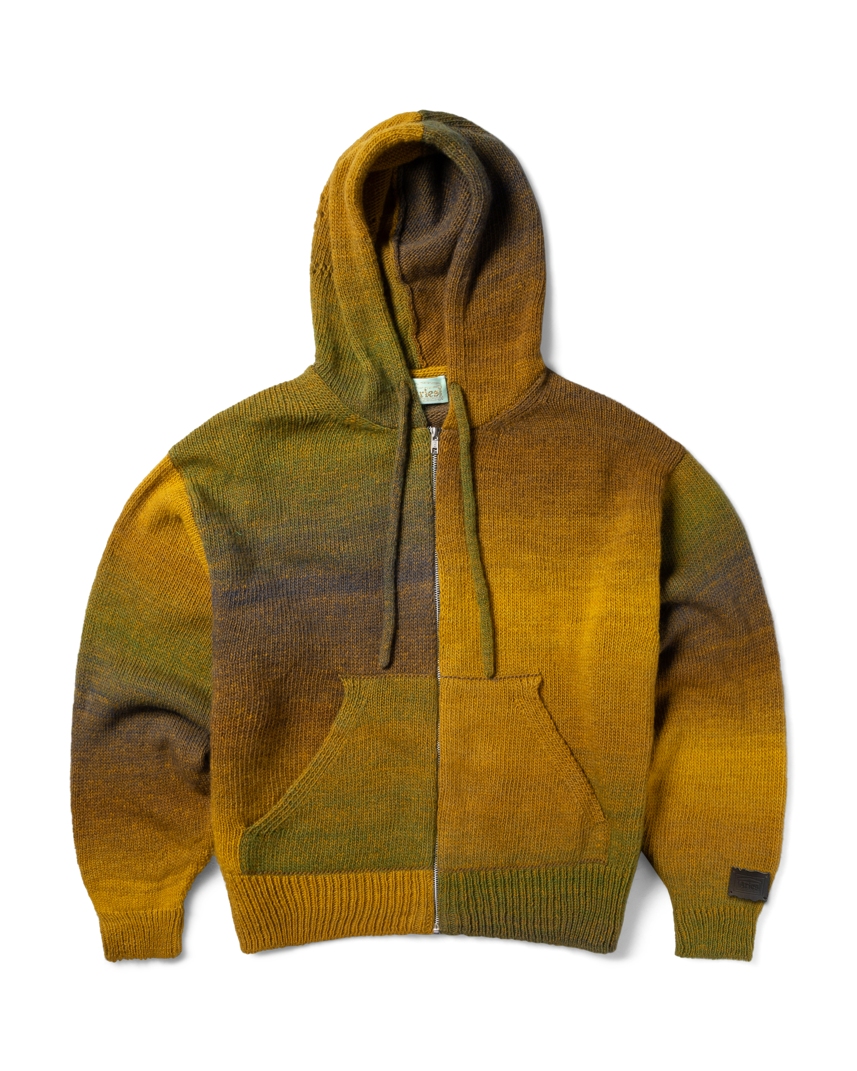 Knitted zip thru hoodie in a space dye wool mix yarn with pointelle Temple branding on the hood.