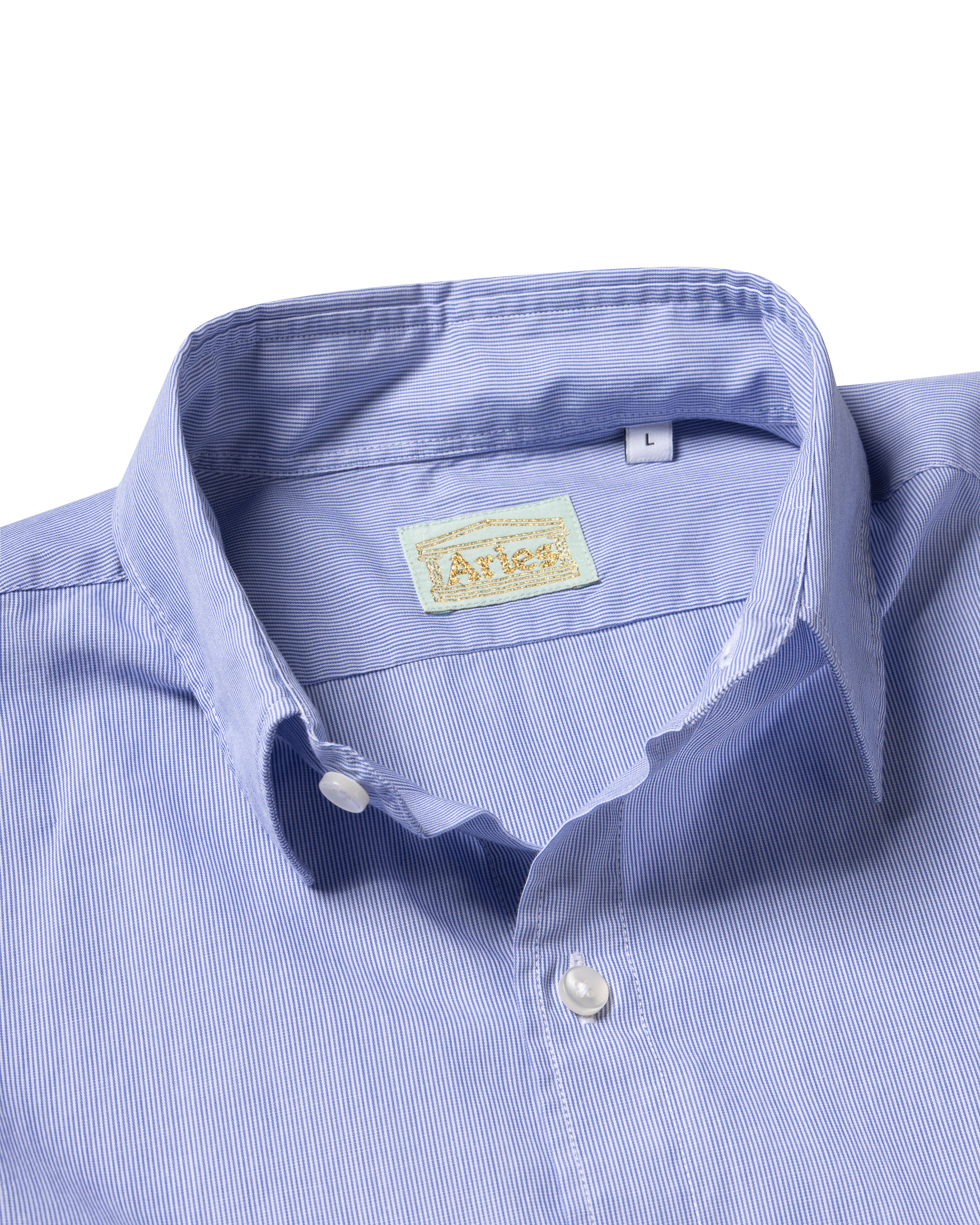 Classic stripe cotton LS shirt with gold embroidered temple logo on left chest. 100% cotton