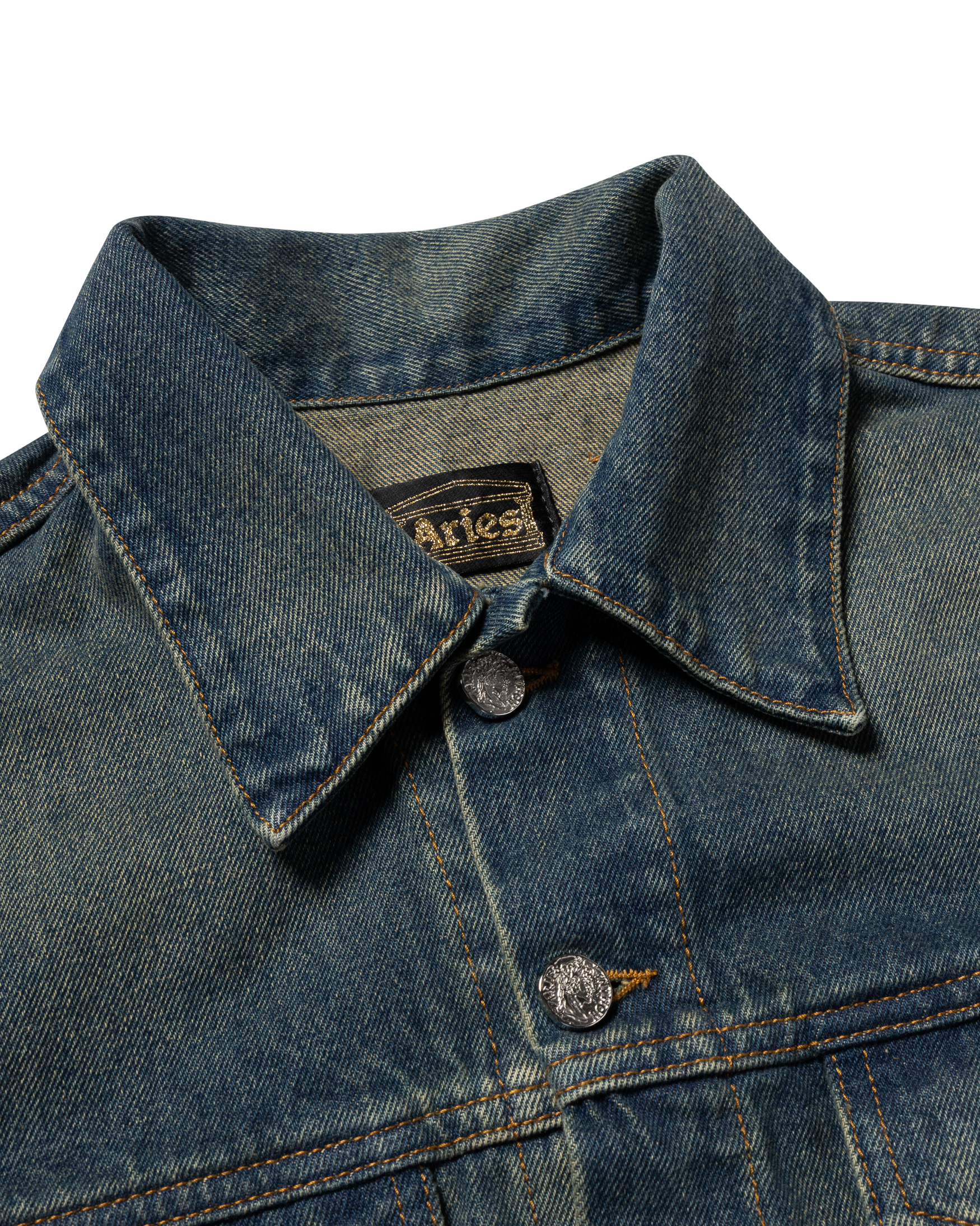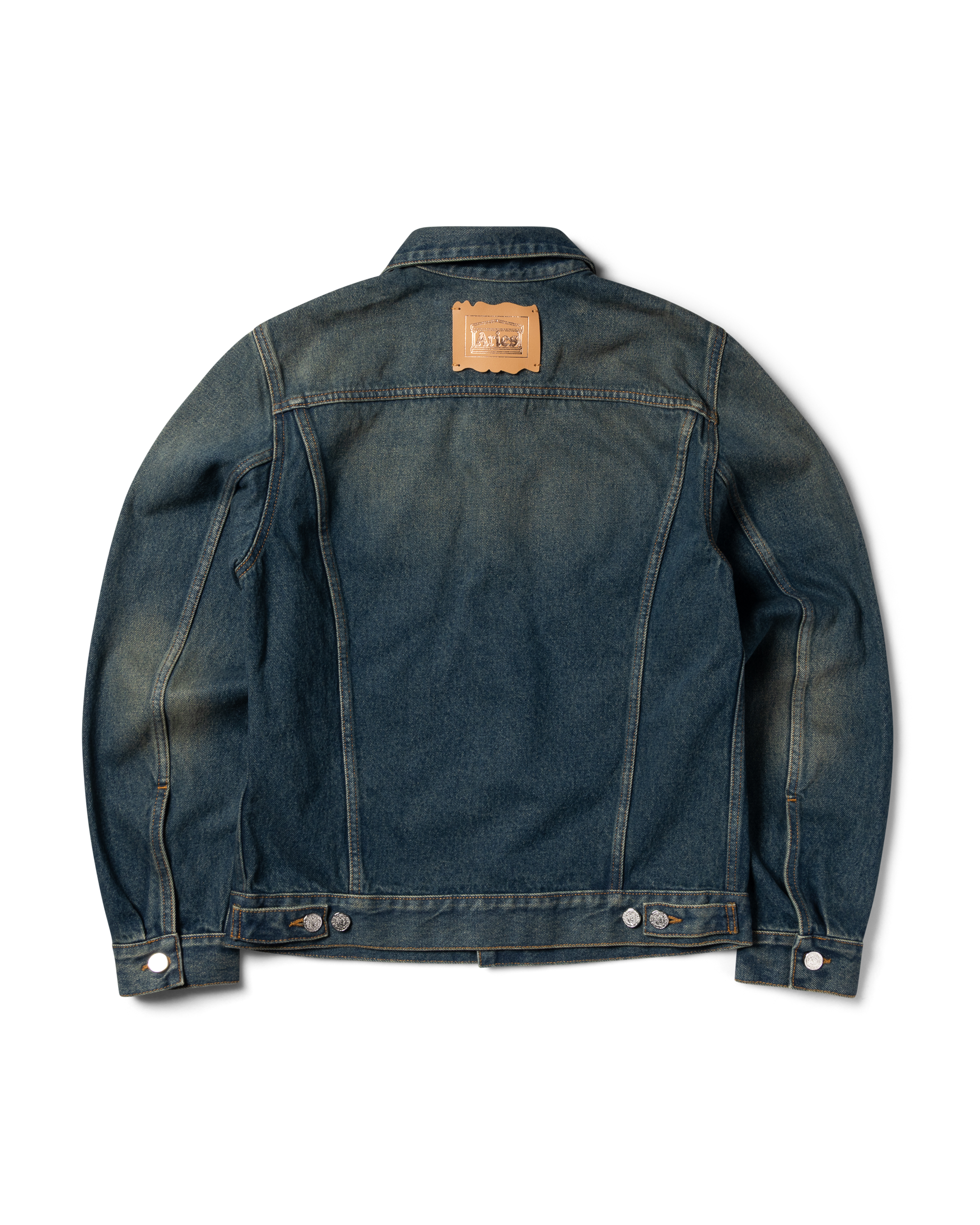 Unisex denim trucker jacket. Made out of 100% cotton indigo denim a vintage wash. Roman Coin Buttons and Leather Denim Patch