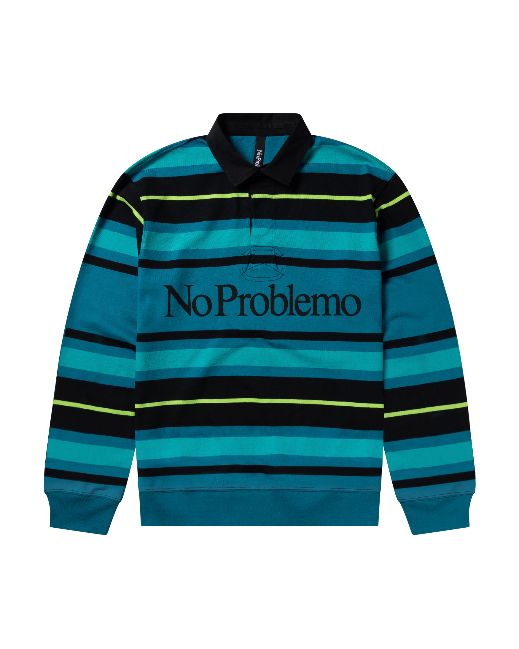 Striped Jersey Rugby Shirt with Cuffed Sleeves and Bottom hem, featuring 'No Problemo' logo printed on the front.