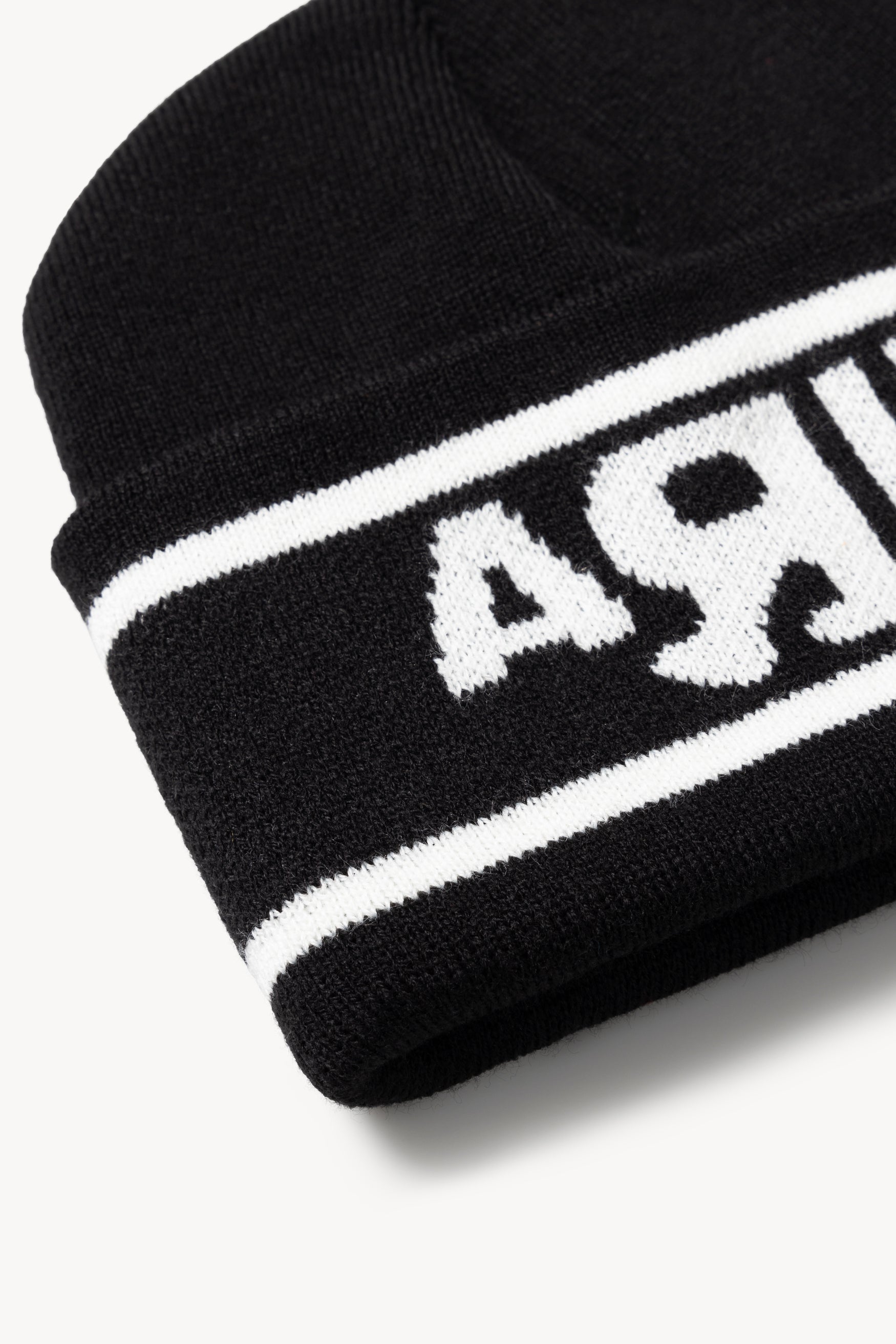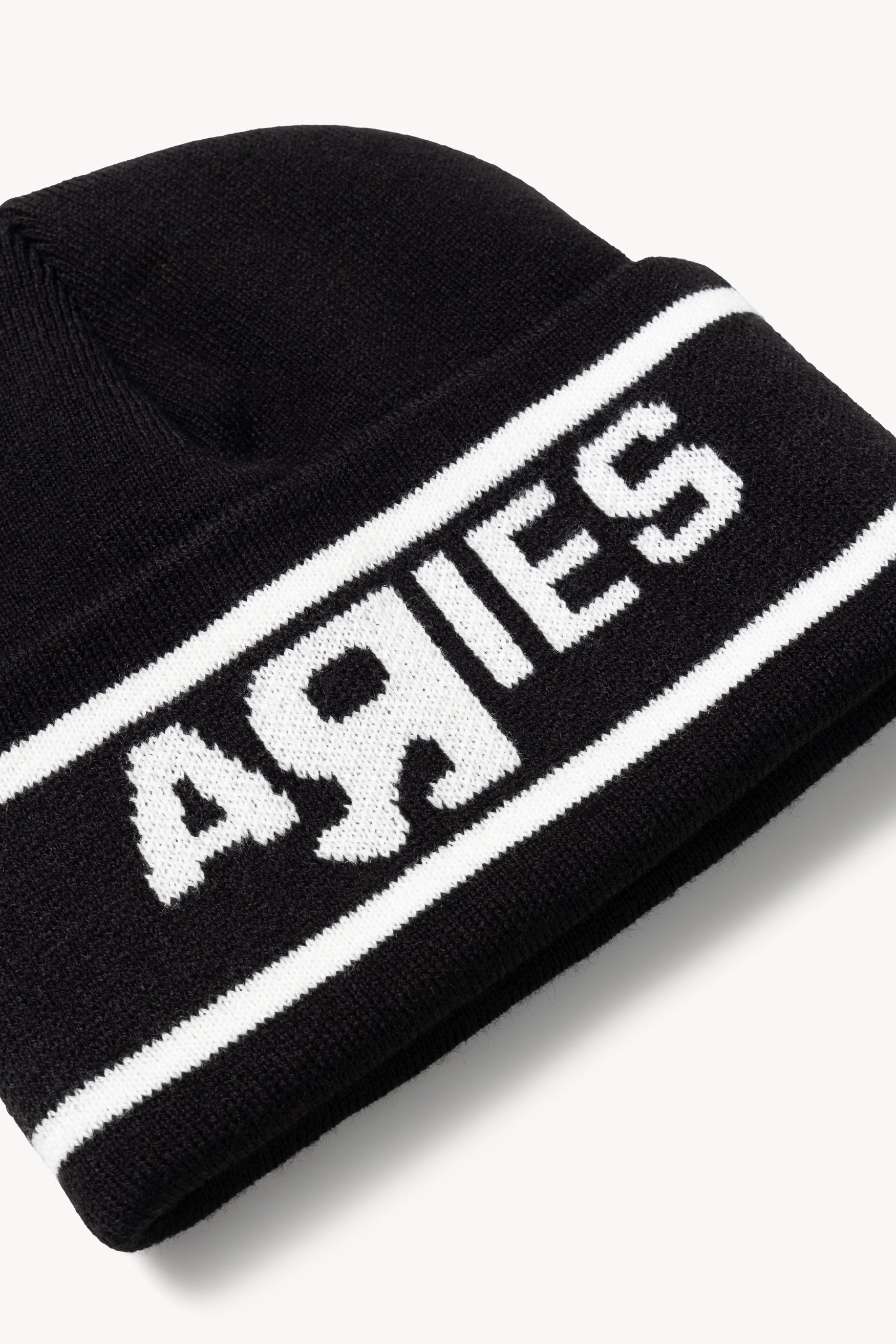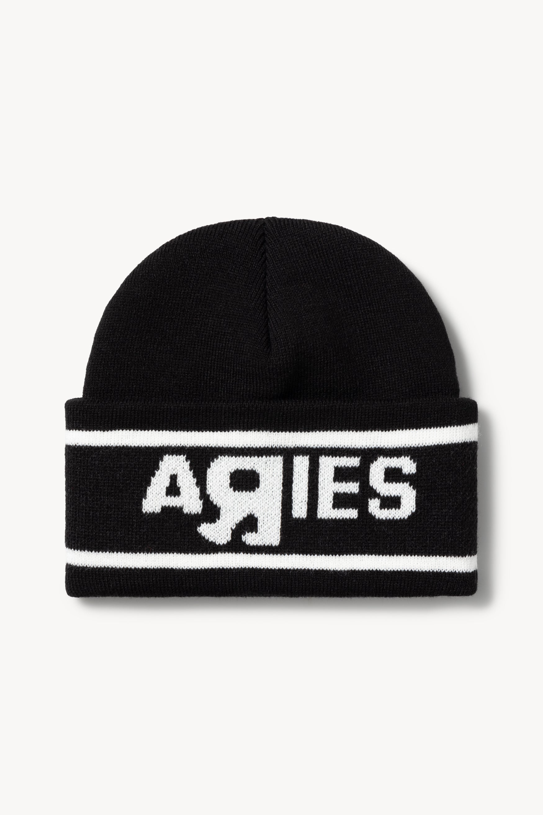 Rib knit beanie with fold-over cuff with jacquard Aries GYOW and Vans logos. Comes in black and white.
